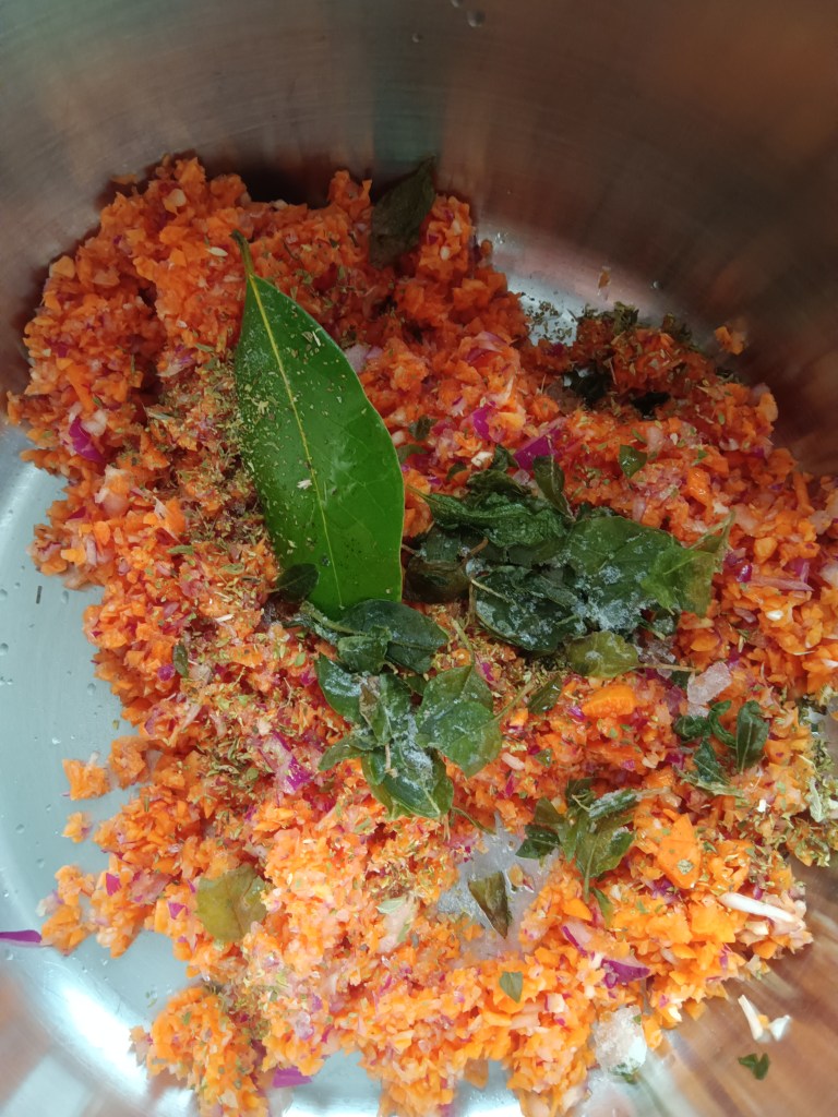 1. În vasul de inox am adăugat o lingură cu ulei de măsline. Am pus ceapa, morcovul și usturoiul tocate mărunt.