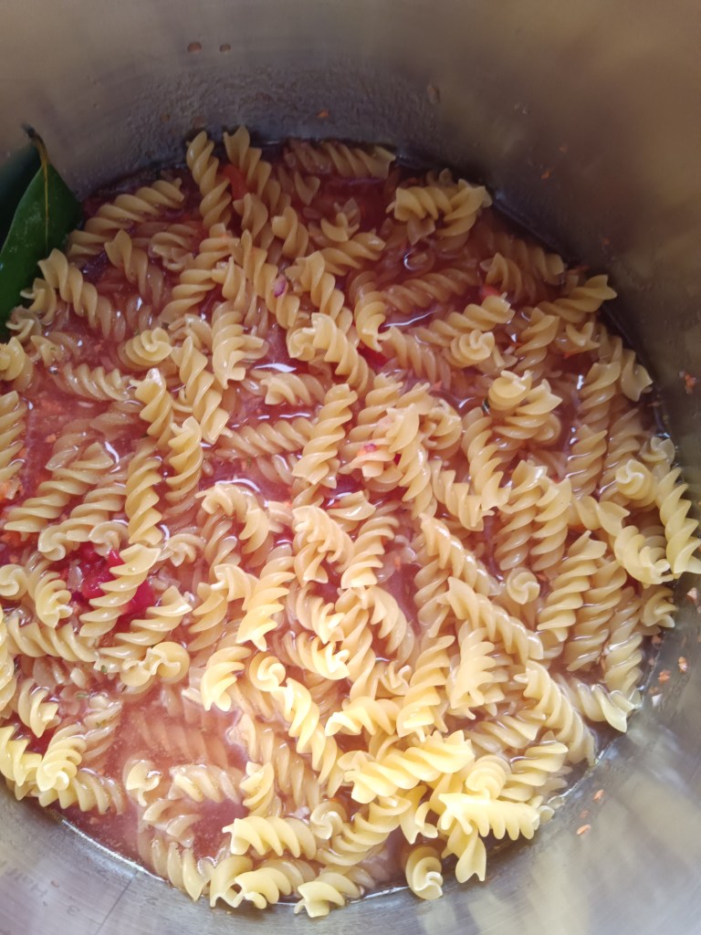 2. Am adăugat conserva de roșii, pastele și toate condimentele. Am pus apoi apa rece și am amestecat puțin. După cum apare și în poză, apa nu acoperă pastele.
