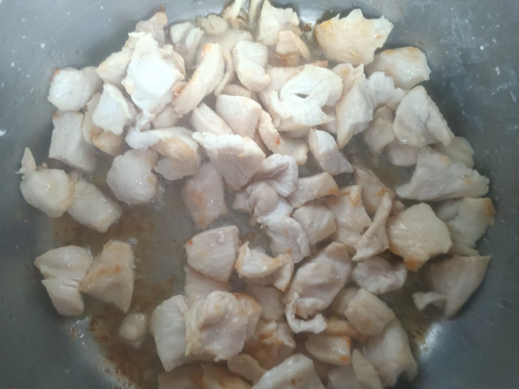 1. Am început prin a tăia pieptul de pui in cuburi mici (ca să mă asigur că vor fi gătite rapid) și am pornit setarea ”Saute”. Am adăugat uleiul, untul și pieptul de pui în vasul de inox.