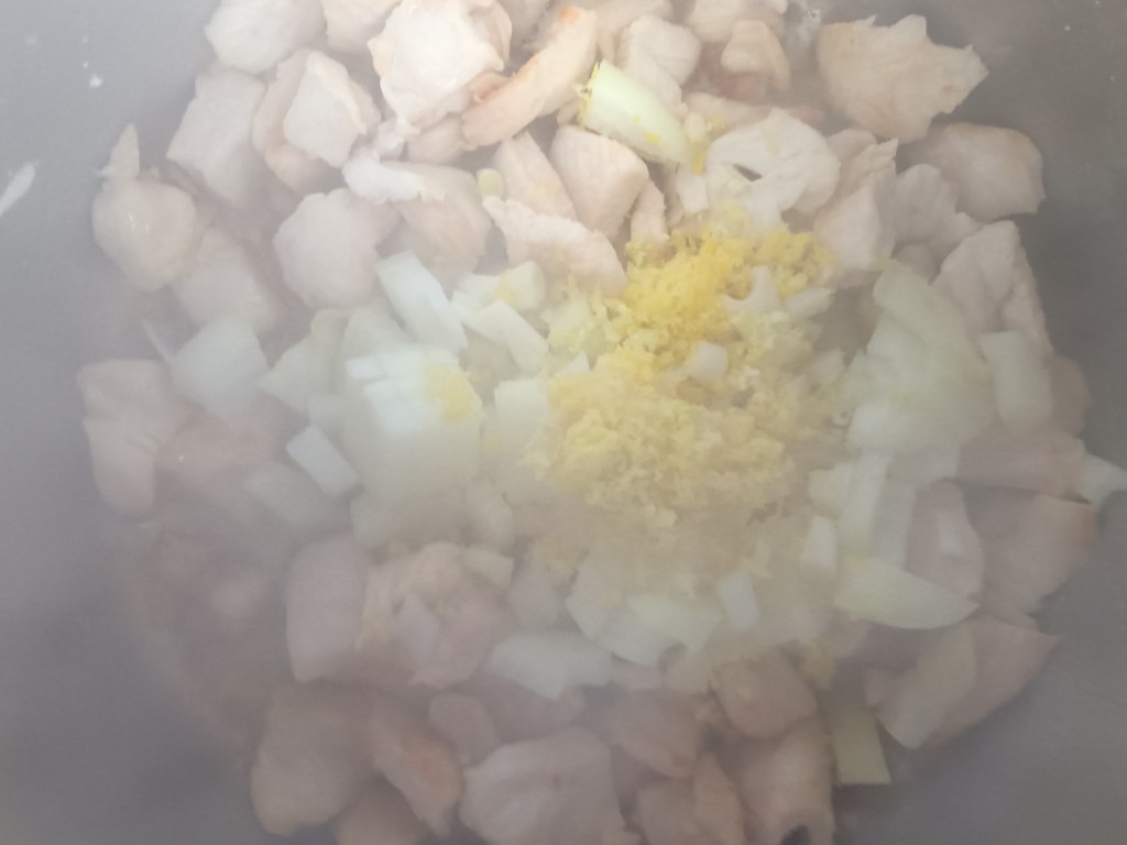 2. După ce acesta a luat puțină culoare, am pus ceapa, usturoiul, coaja și sucul de la o jumătate de lămâie, apa fierbinte, orezul și condimentele. Am amestecat bine.
