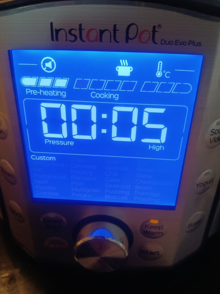 3. Am oprit funcția SAUTE, am închis capacul și am selectat Pressure Cook, High, 5 minute. Întrucât am folosit funcția de sotare în pasul anterior și am adăugat apă fierbinte pentru gătire, a durat mai puțin de 90 de secunde pentru ca aparatul să intre în programul de gătire.