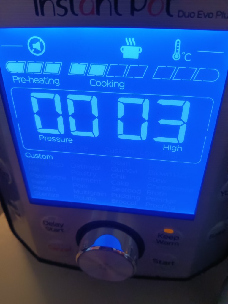 3. Am închis capacul și am selectat Pressure Cook, High, 3 minute. Dacă folosiți cartofi cruzi, îi tăiați cuburi mici și creșteți timpul la 5 minute.