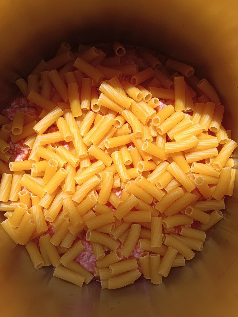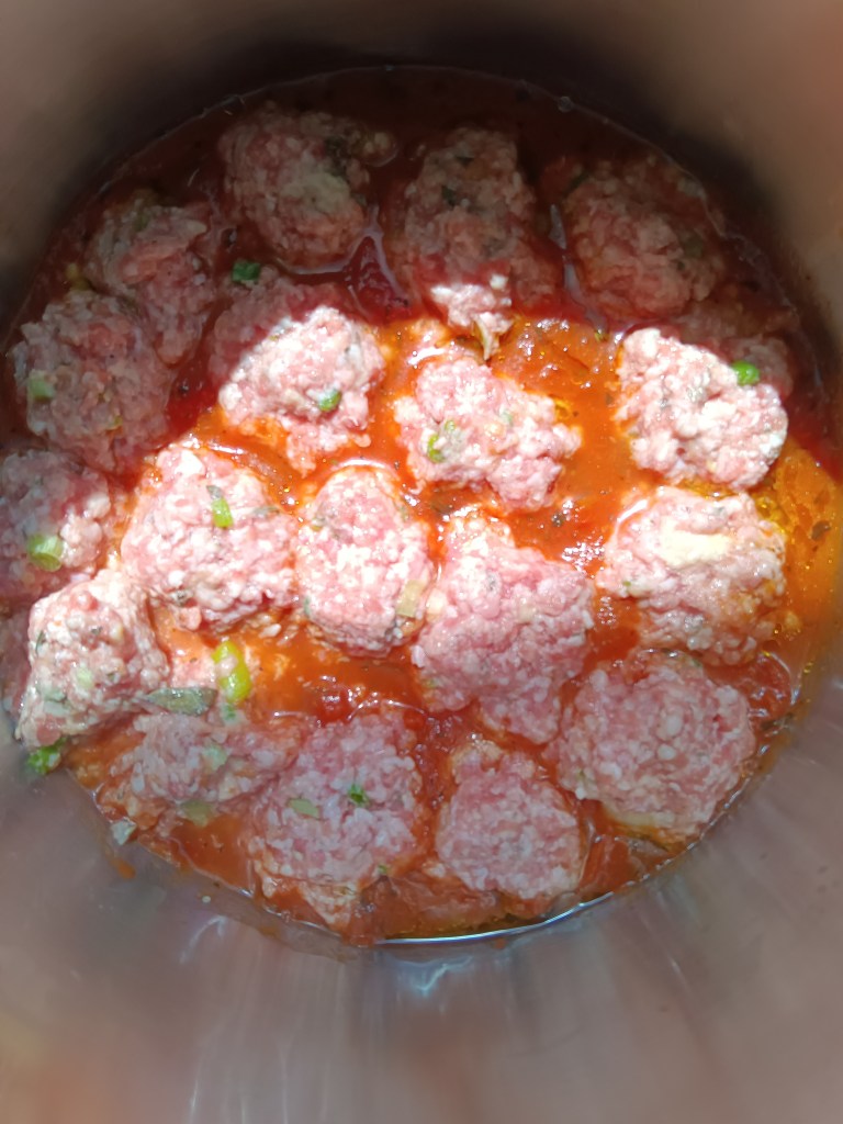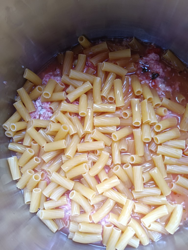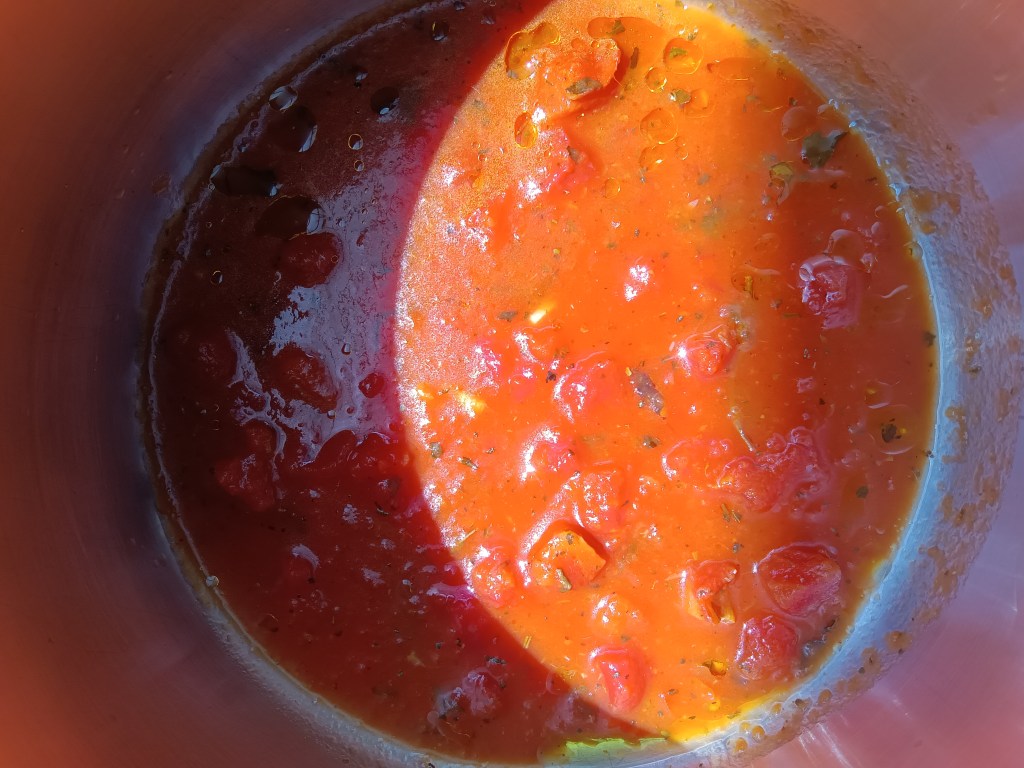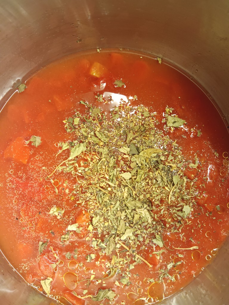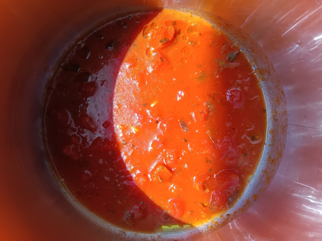 1. Am început prin a pregăti Sosul Marinara. În vasul de inox am adăugat o lingură de ulei, conserva de roșii tocate, sare, piper, o linguriță de cimbru, o linguriță și jumătate de busuioc, jumătate de cană de apă fierbinte. Am închis capacul și am selectat opțiunea Pressure Cook, High, 5 minute. Când a expirat timpul, am lăsat să scadă singură presiunea timp de 10 minute și apoi am scos rapid ce mai rămăsese. Eu am făcut etapa asta dimineață și am scăpat de grija sosului.