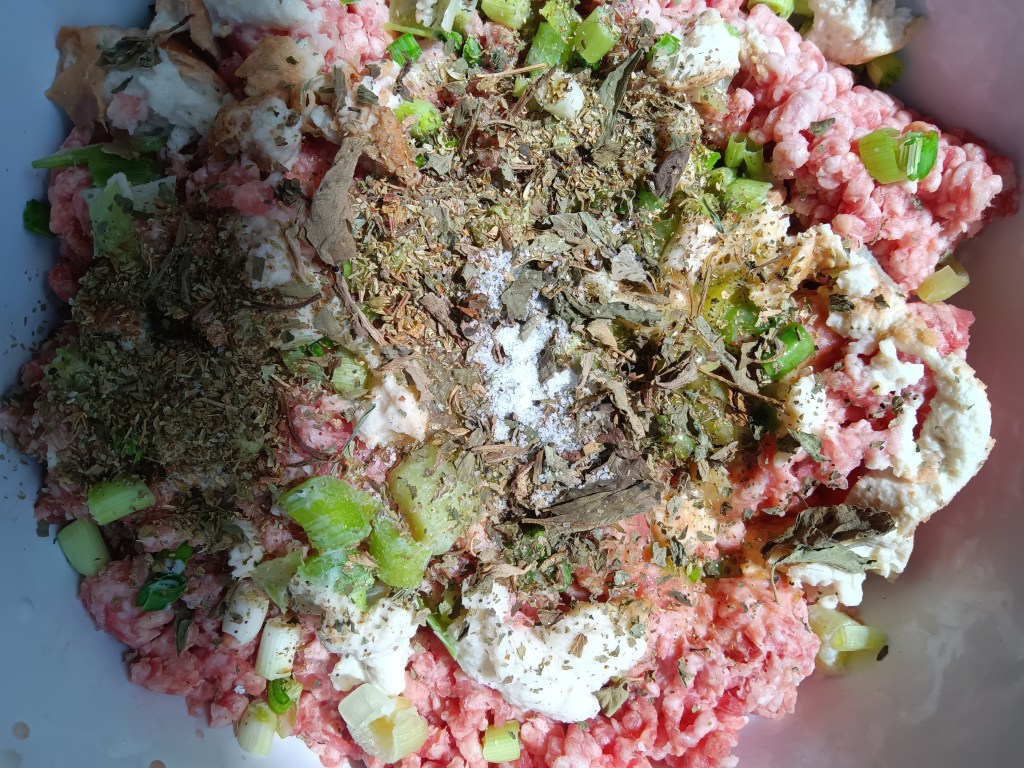 2. Cu jumătate de oră înainte de prânz, am pus o felie de pâine într-un bol și am adăugat peste ea laptele, am lăsat-o să se înmoaie câteva clipe. Am pus carnea tocată într-un bol împreună cu o ceașcă de praz, usturoiul, pâinea, laptele, oul și condimentele: sare, piper, o linguriță de cimbru și o linguriță și jumătate de busuioc uscat. Am amestecat bine.