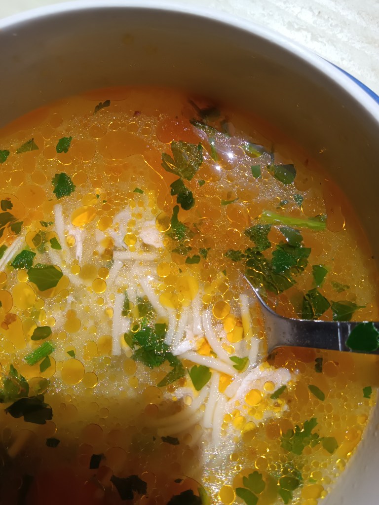 2. În vas au rămas aproximativ 2 litri de lichid peste care am adăugat încă un litru de apă fierbinte, sucul de la o lămâie, jumătate de legătură de pătrunjel și două mâini de fidea.
