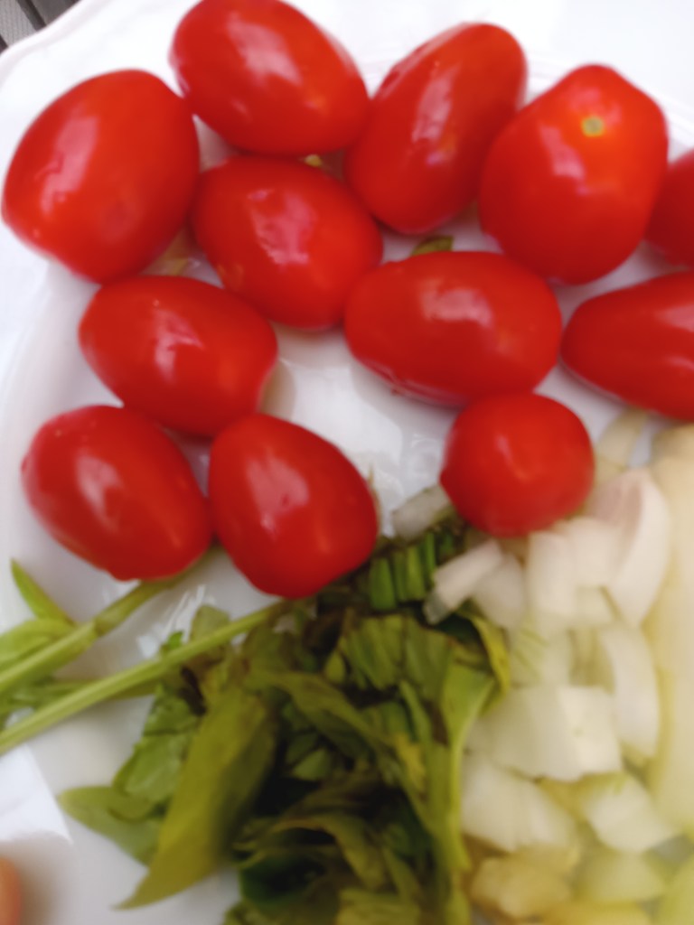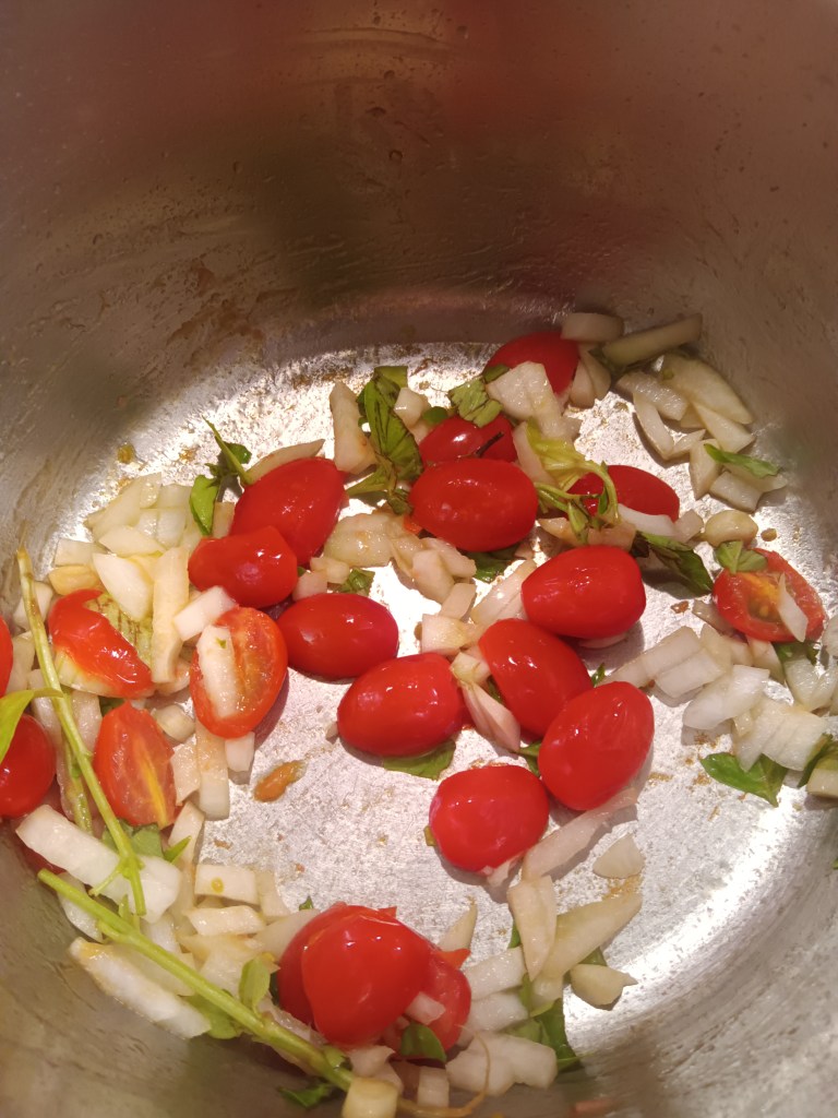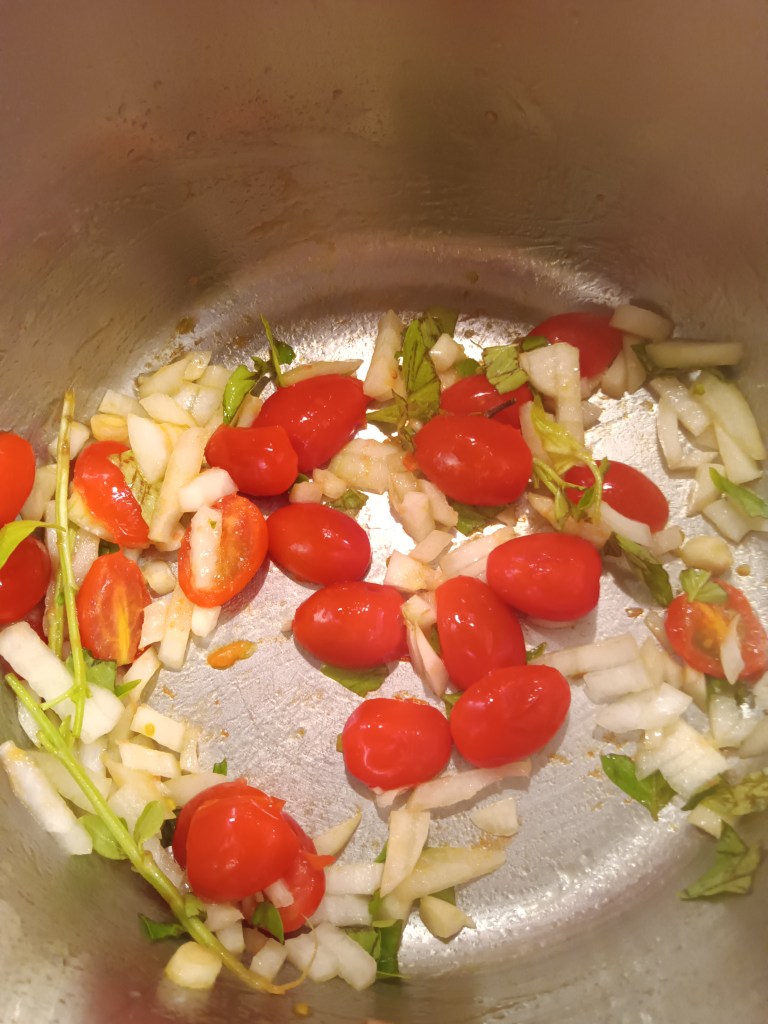 2. Când a expirat timpul, am scos rapid presiunea și am scurs fasolea. În vasul de inox am adăugat ulei de măsline și am pus roșiile cherry tăiate în jumătate. După 30 de secunde, am adăugat ceapa, usturoiul, condimentele și busuiocul (atât frunzele tăiate, cât și crenguțele). Peste ele am adăugat jumătate de linguriță de bulion concentrat și jumătate de cană de apă fierbinte. Am amestecat bine. Am închis capacul și am selectat Pressure Cook, High, 1 minut.