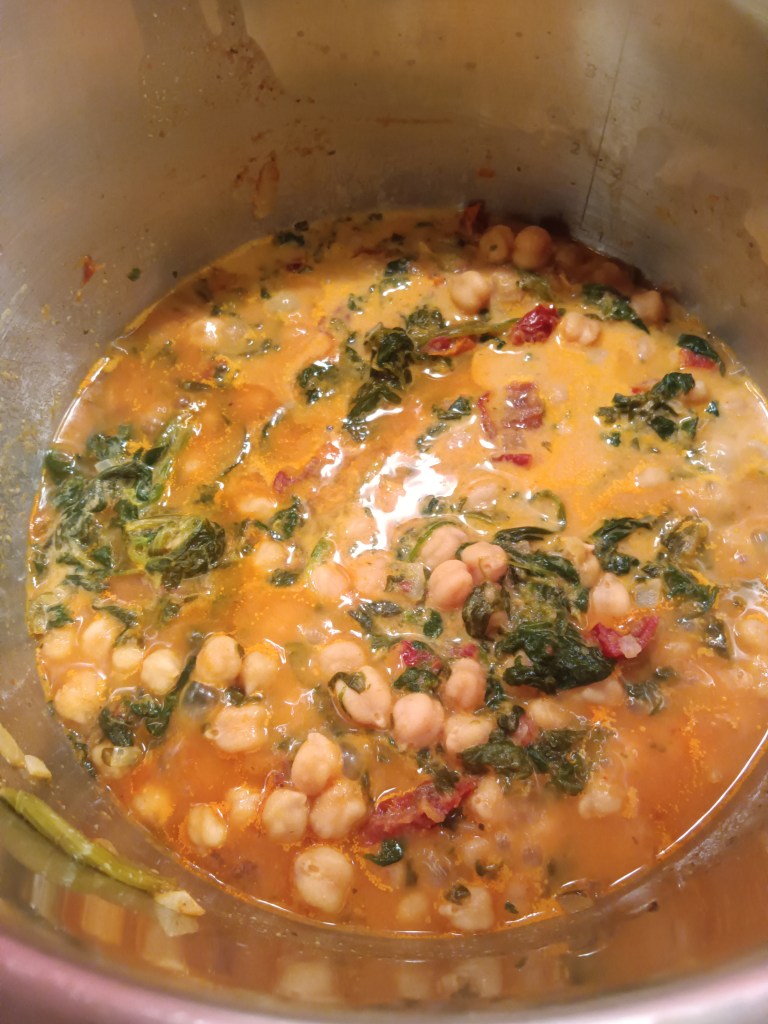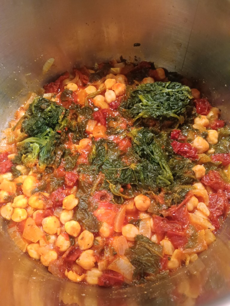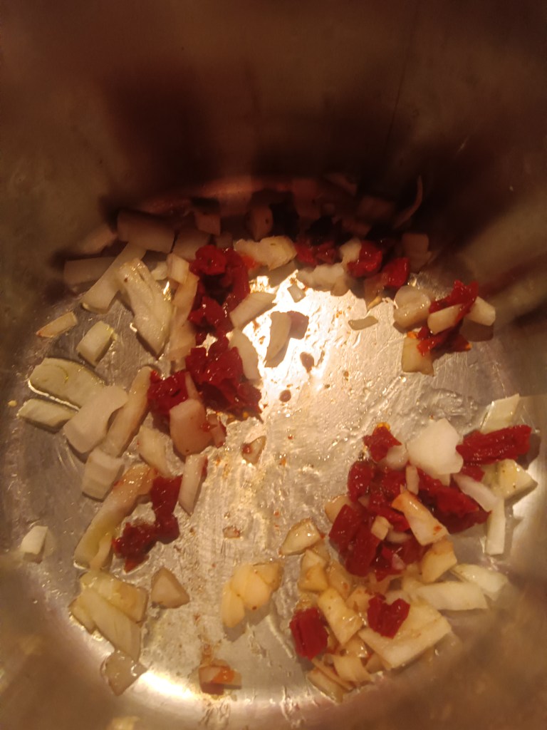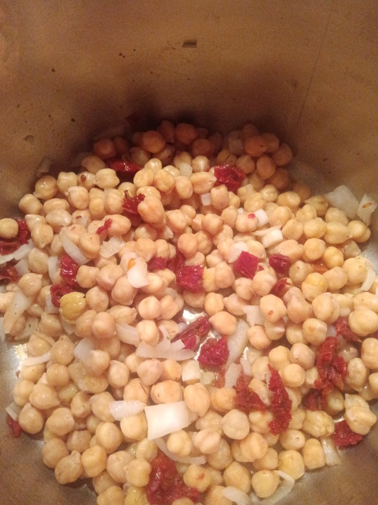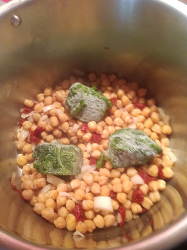 1. Am activat setarea SAUTE și am adăugat în vas ceapa, roșiile uscate, usturoiul, năutul, bulionul de roșii, spanacul și apa. Am amestecat bine. Eu am activat această funcție pentru a se încălzi vasul și pentru a intra mai repede in programul de gătire.
