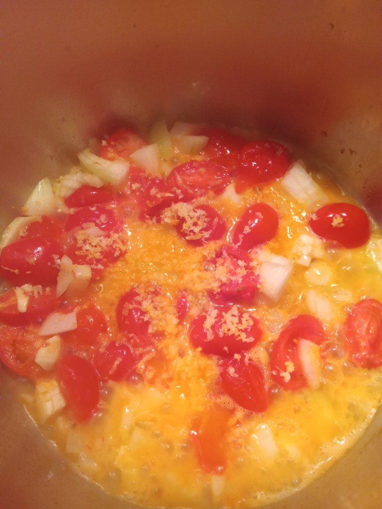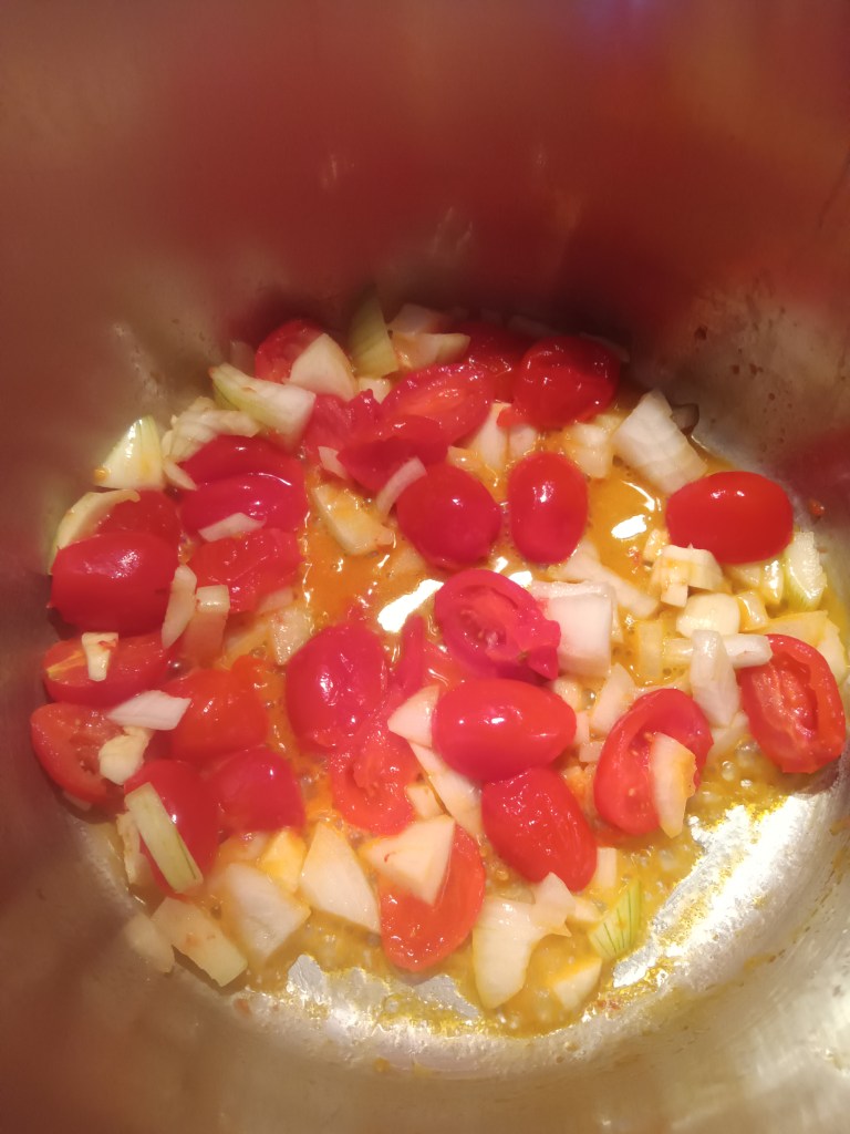 2. Am scurs fasolea. Între timp, am pus ulei de măsline în vasul de inox și am pornit setarea SAUTE. Am adăugat întâi roșiile tăiate, iar după două minute, am pus ceapa, usturoiul, coaja de lămâie, sarea și piperul. Am pus apoi fasolea, sucul de la jumătate de lămâie, mentă și apa. Am amestecat bine.