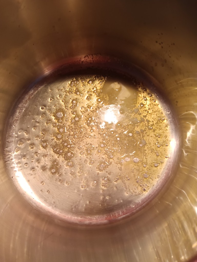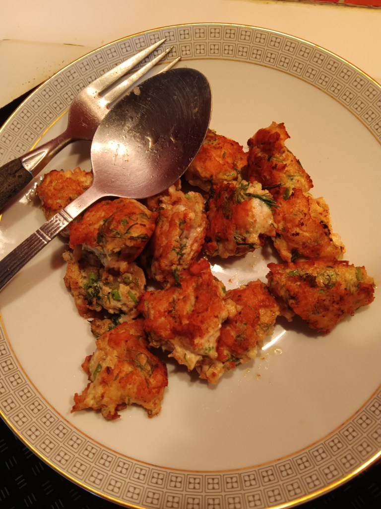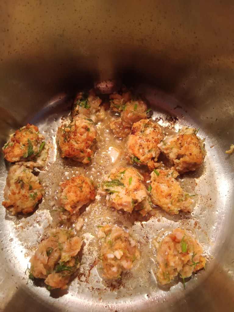 1. Intr-un bol, am pus carnea tocată, oul bătut, doi căței de usturoi tocați, menta, mărarul, pesmetul și condimentele. Am pornit setarea Sauté și am adăugat în vas ulei de măsline și puțin unt. Când a început să se încălzească vasul, am pus chiftelele formate cu lingurița (😉). Le-am rumenit pe toate părțile, aproximativ 2 minute pentru fiecare grup. Pentru cantitatea acesta, am avut nevoie de aproximativ 10 minute pentru aceasta etapă.