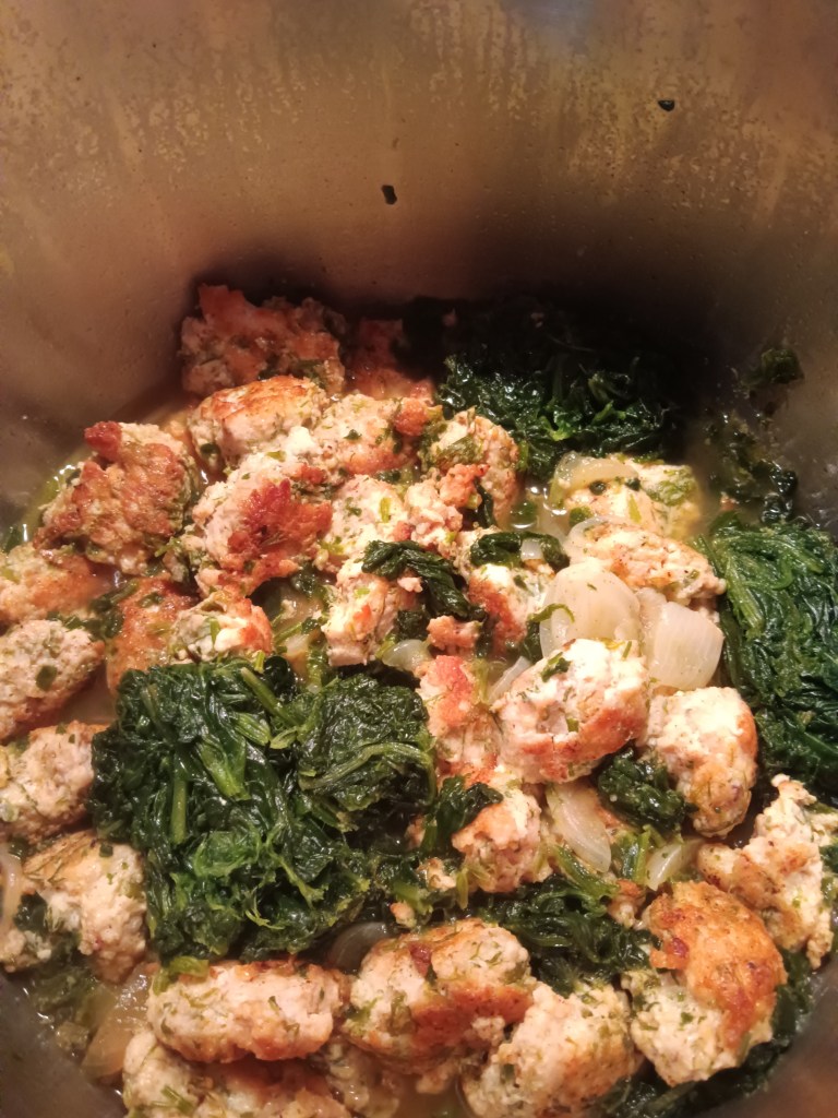 2. Când toate chiftelele au fost gata și le-am scos din vas, am pus ceapa și usturoiul, am adăugat spanacul congelat. Am pus apoi toate chiftelele, condimentele și apa. Am oprit opțiunea de sotare.