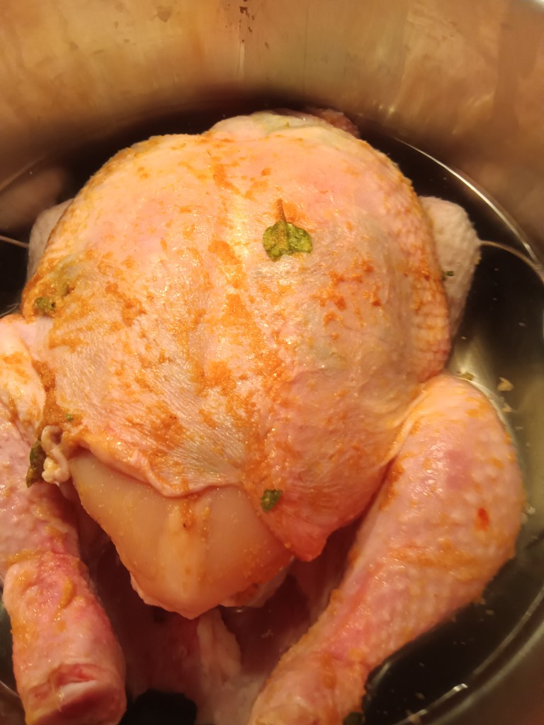 1. Am adăugat o cană de apă în vasul de inox și apoi am așezat trivetul. Am amestecat toate condimentele, mai puțin mierea (pe care am adăugat-o când am introdus puiul in cuptor), cu uleiul și usturoiul mărunțit. Cu jumătate din acest amestec am uns puiul pe toate părțile, am introdus pe sub pielea de la piept și de la picioare.