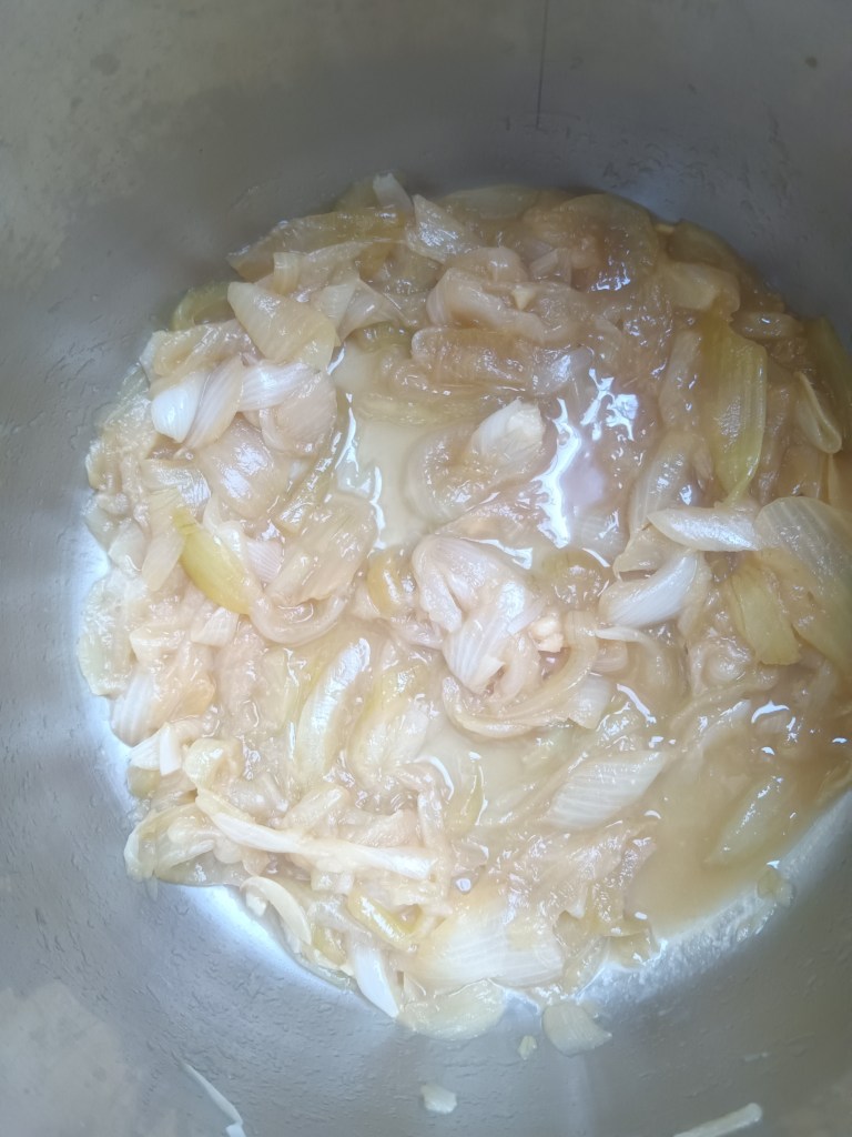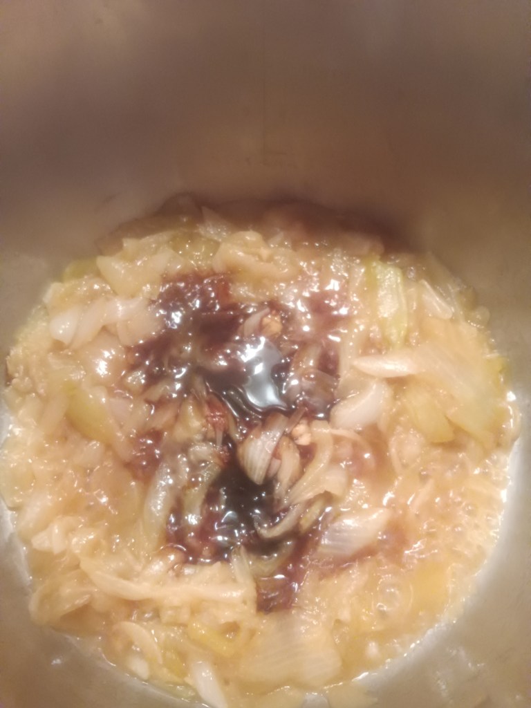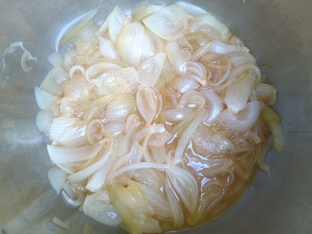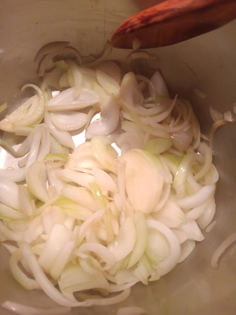 1. Am activat funcția Sauté și am pus în vas cele trei cepe tăiate julien. Am amestecat în continuu timp de trei minute, până când am observat că ceapa începe să se coloreze și să se înmoaie. Am adăugat sarea și apa, am amestecat și am oprit funcția de sotare.