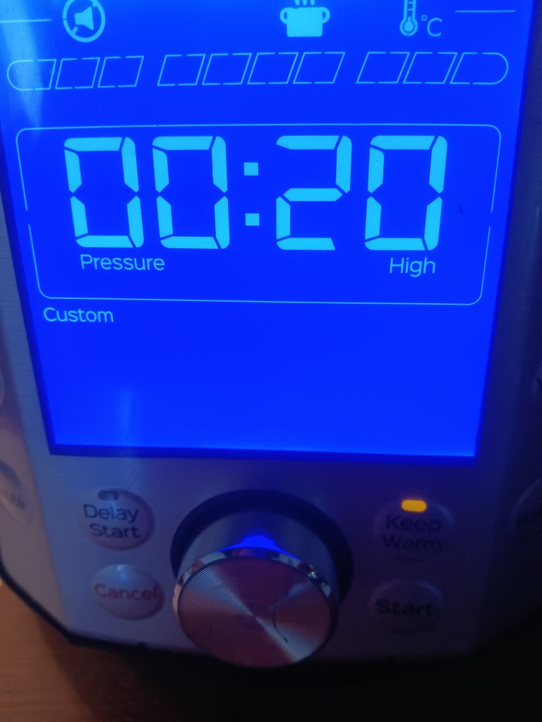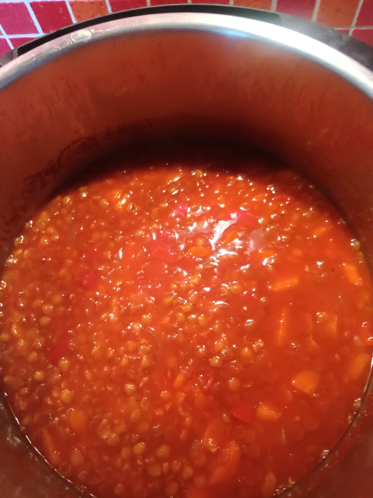 3. Am amestecat totul bine, am adăugat lintea, apa fierbinte și restul condimentelor. Am închis capacul și am selectat Pressure Cook, High, 20 minute.