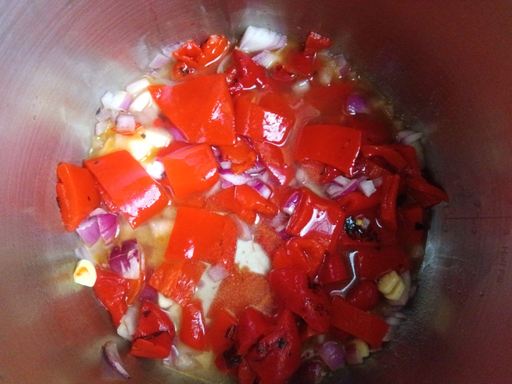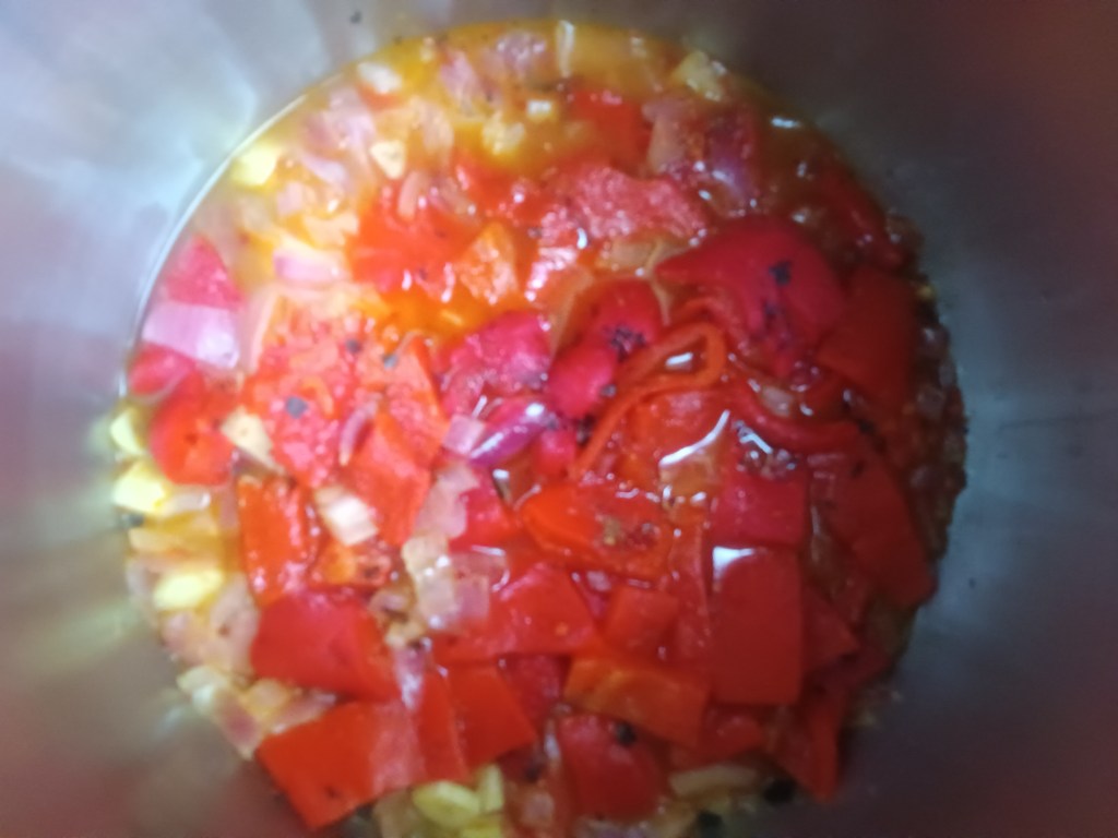 1. Am pornit setarea SAUTÉ și am pus în vas ulei de măsline. Am adăugat ceapa, usturoiul, ardeiul tăiat, condimentele și apa. Am amestecat totul.