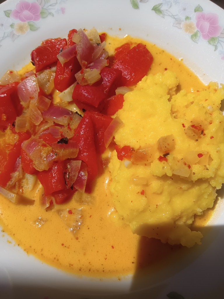 ✅ o cană cu apă fierbinte (am pus întâi în cană zeama lăsată de ardeii copți și apoi am completat cu apă fierbinte)