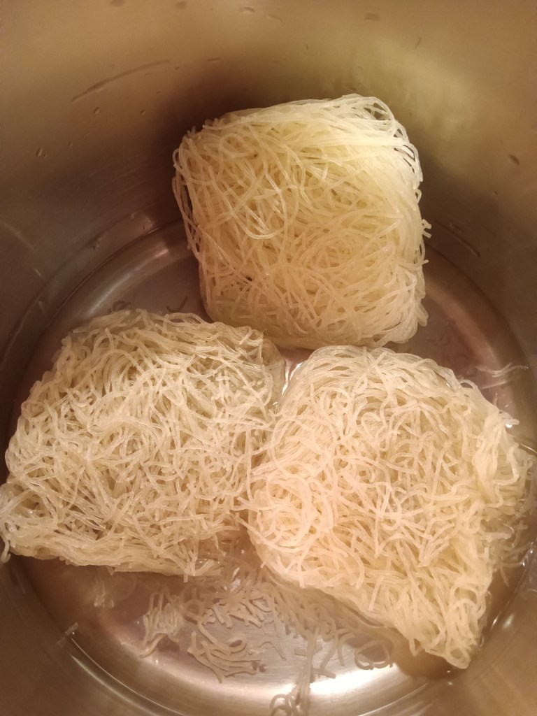 1. Am pus o cană și jumătate de apă rece în vasul de inox și am adăugat acolo cele trei pachete de Noodles de orez. Am înmuiat in apă , apoi am intors pe partea cealaltă (astfel încât să fi fost udate pe ambele părți). Din fotografii puteți vedea că apa nu ajunge să fie nici măcar până la nivelul pachetelor de Noodles. Am închis capacul și am selectat Pressure Cook, High, 1 minut. Când a expirat timpul, am scos rapid presiunea, am scurs apă și am clătit acești Noodles cu apă rece. I-am lăsat deoparte.