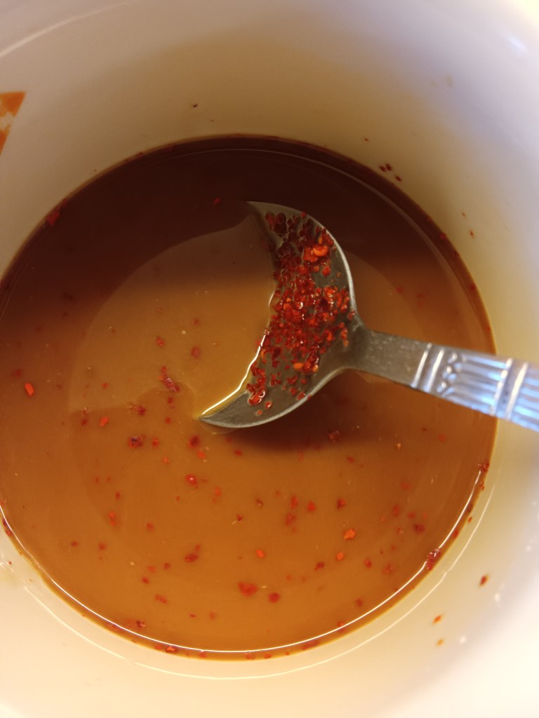 - Dupa 3 minute am adăugat ceapa, usturoiul, ghimbirul, ardeiul gras și amestecul de legume. Între timp am pregătit sosul. Într-o cană am pus o lingură de amidon de porumb și două linguri de apă rece. Am amestecat bine. Am adăugat apoi trei linguri de sos de soia, fulgii de ardei, o linguriță de miere și restul de apă rece. Am amestecat bine și apoi am adăugat lichidul obținut peste carnea și legumele din vasul de inox.