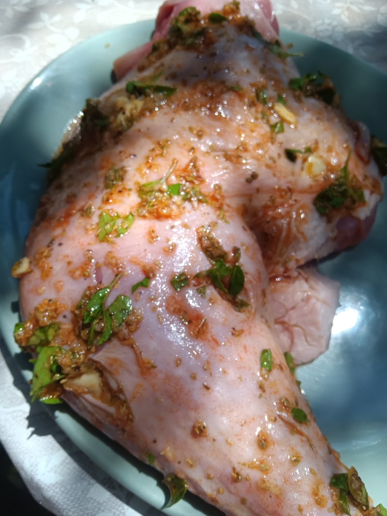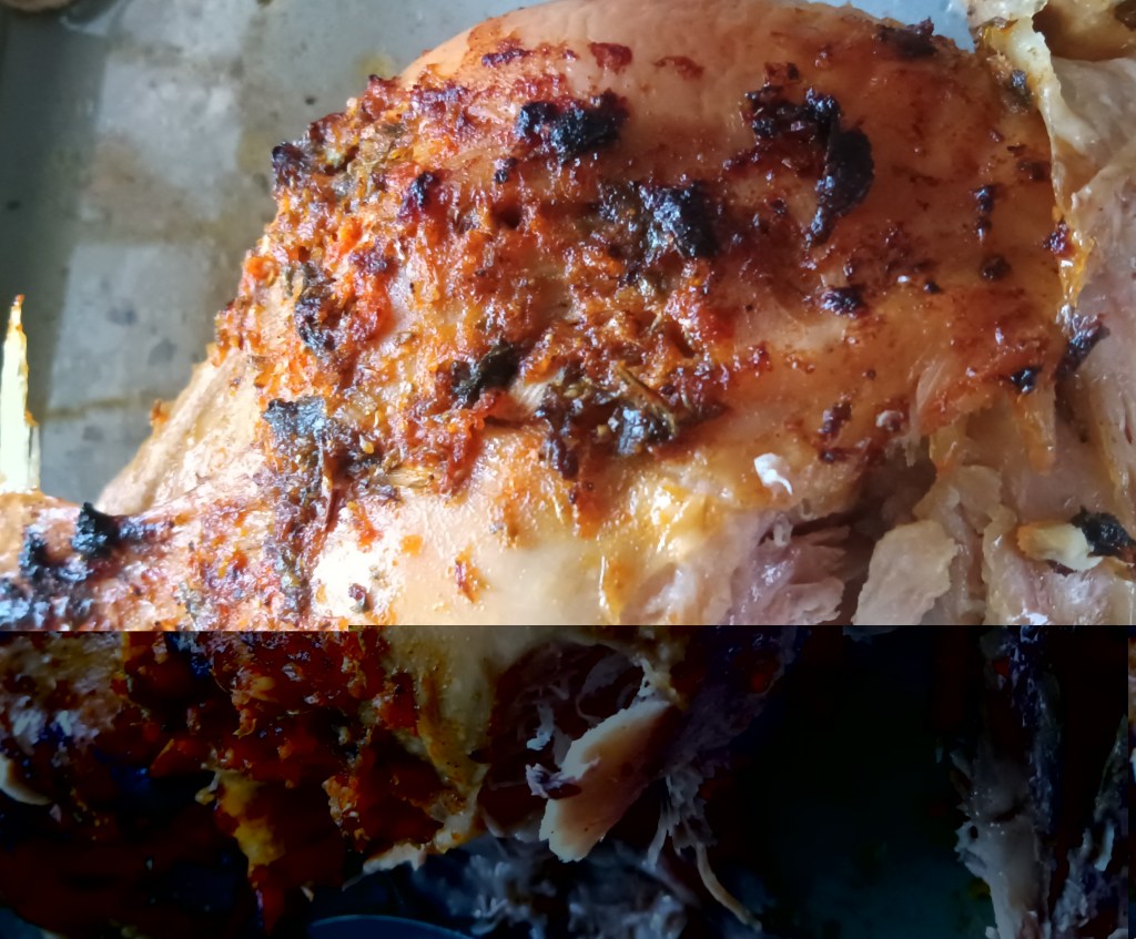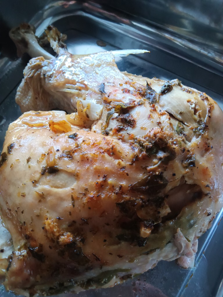 - Am pregătit întâi sosul combinând uleiul de măsline, boiaua dulce, usturoiul, sarea, piperul, busuiocul verde, sucul de lămâie și oregano. Am folosit jumătate din cantitate pentru a unge pulpa de curcan.