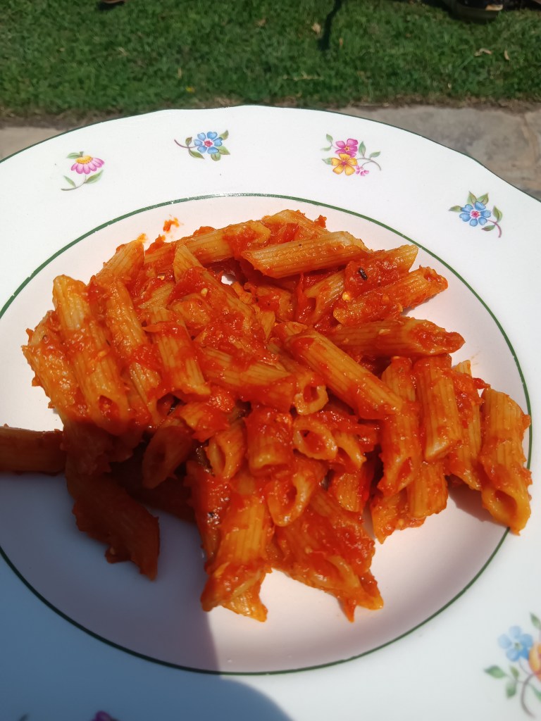 - Când a expirat timpul, am scos rapid presiunea și am blenduit legumele. Am adăugat cealaltă jumătate de pahar cu apă, am amestecat bine și am pus apoi pastele. Am amestecat ușor pastele în sos.