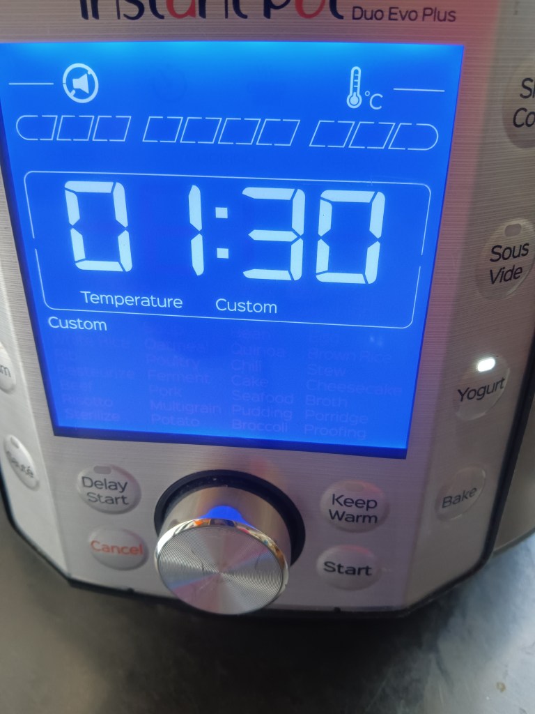 2. Am pus o lingură de ulei de măsline în vasul Instant Pot și, cu o pensulă am uns baza și pereții. Am pus aluatul. Am inchis capacul, am selectat opțiunea Yoghurt, Custom și, automat, a fost setată 1 ora și 30 de minute.