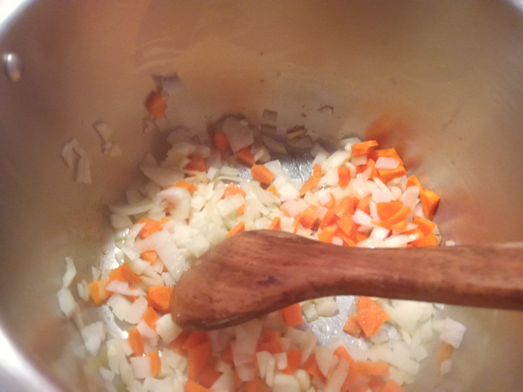 1. Am pornit setarea Sauté și am adăugat în vas ceapa, morcovul, usturoiul. După două minute, am adăugat roșiile din conservă, lintea, apa, bulionul și condimentele.