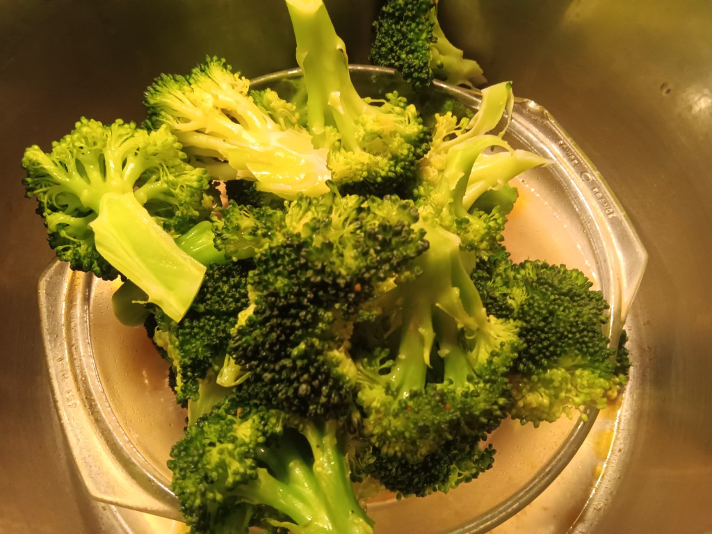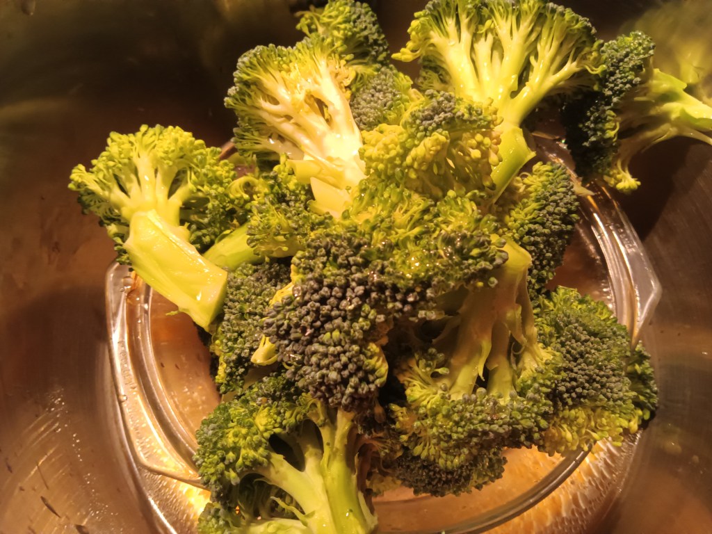 2. Când a expirat timpul, am scos rapid presiunea. Noi am avut un bol cu amestecul de ulei de măsline și lămâie și fiecare și-a adăugat peste broccoli cât a dorit.