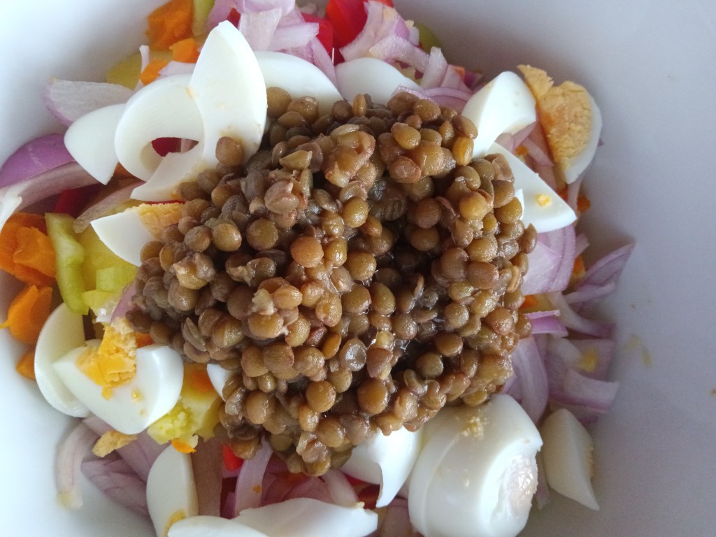 4. Când a expirat timpul, am scos rapid presiunea (QR), am curățat cartofii și morcovii, i-am tăiat. Peste ei am adăugat lintea, sosul, legumele crude, ouăle fierte și am amestecat bine să se întrepătrundă aromele.