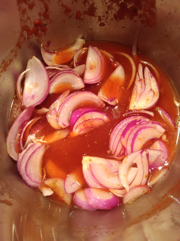 - În vasul de inox am adăugat uleiul de măsline, am pus conserva de roșii și condimentele. Am selectat Pressure Cook, High, 5 minute. Când a expirat timpul, am scos rapid presiunea și am blenduit tot sosul. L-am pus deoparte într-un bol.