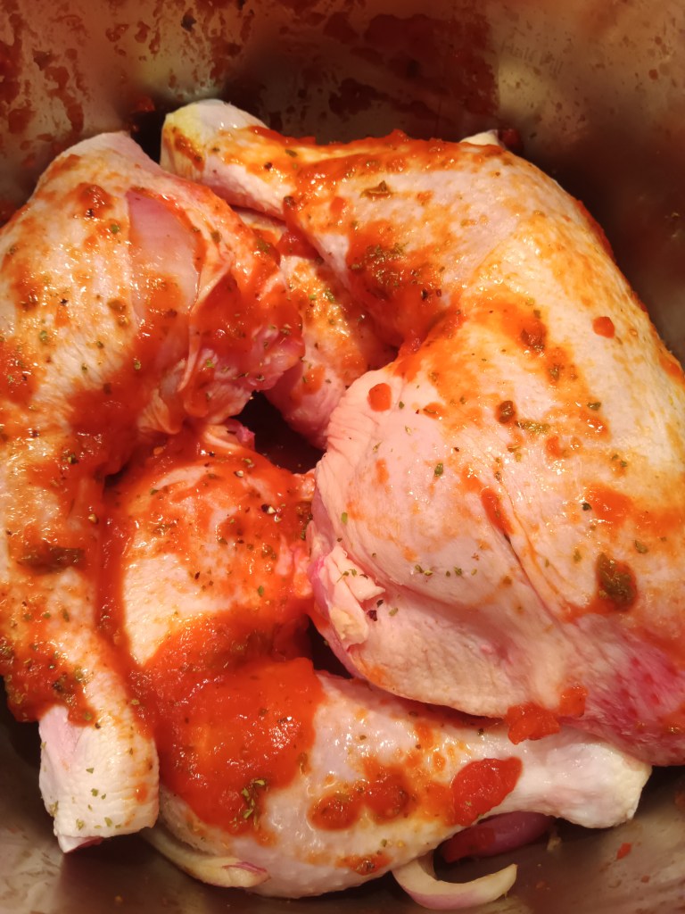 2. În același vas, am pus o ceapă tăiată solzișori. Peste ea am pus apa rece și am așezat pulpele de pui. Am pus sare, piper, oregano și o lingură de sos marinara pe fiecare pulpă de pui. Am adăugat și usturoiul tăiat rondele și o lingură de ulei de măsline. Am închis capacul și am selectat Pressure Cook, High, 10 minute.