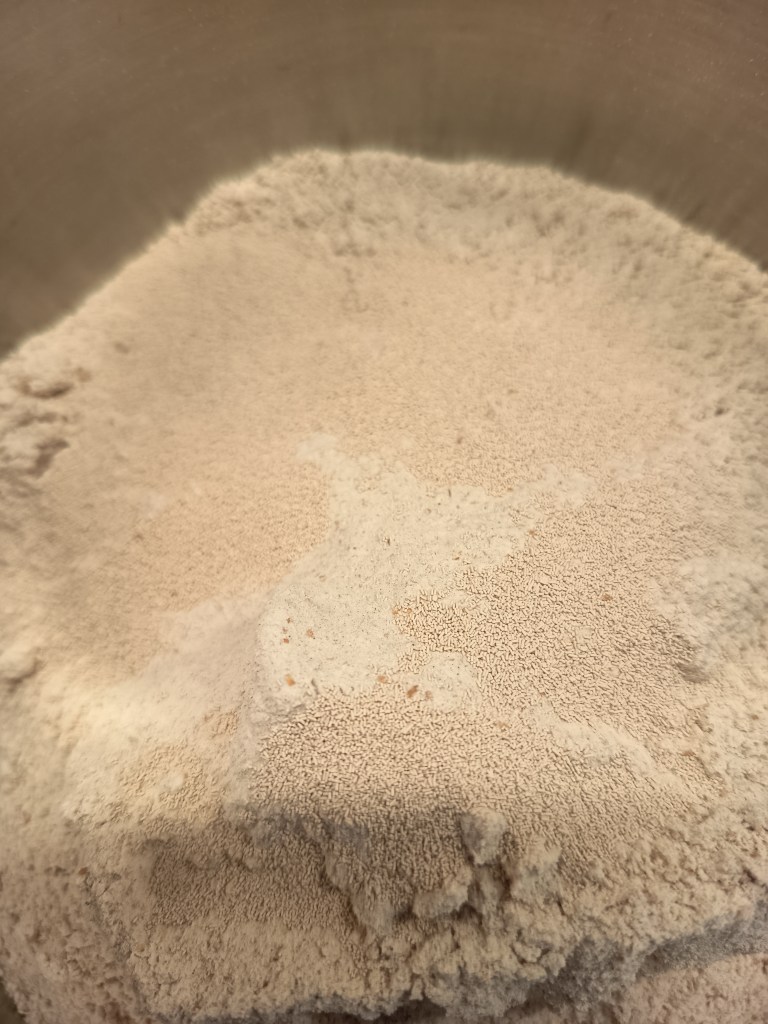 - Am pus apa la încălzit. Între timp, într-un bol am pus făina, drojdia, sarea și am amestecat totul cu o lingură. Când apa a început să se încălzească, am pus și apa. Am amestecat bine cu o lingură, cât să se combine toate ingredientele. Am adăugat două linguri de ulei de măsline și am început să frământ cu mâna.