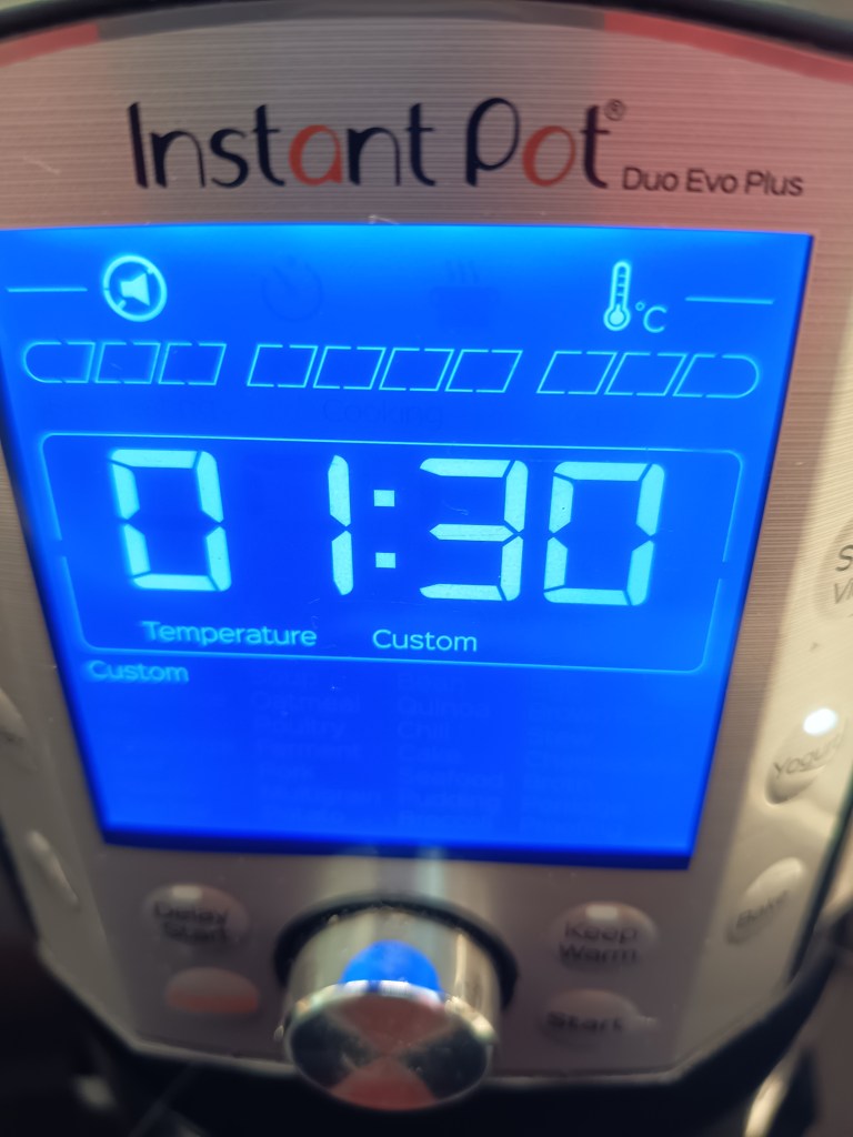 2. Am pus o lingură de ulei de măsline în vasul Instant Pot și, cu o pensulă am uns baza și pereții. În felul acesta aluatul nu se va lipi de vas și va fi foarte ușor de curățat. Am pus aluatul. Am închis capacul, am selectat opțiunea Yoghurt, Custom și, automat, a fost setată 1 ora și 30 de minute.