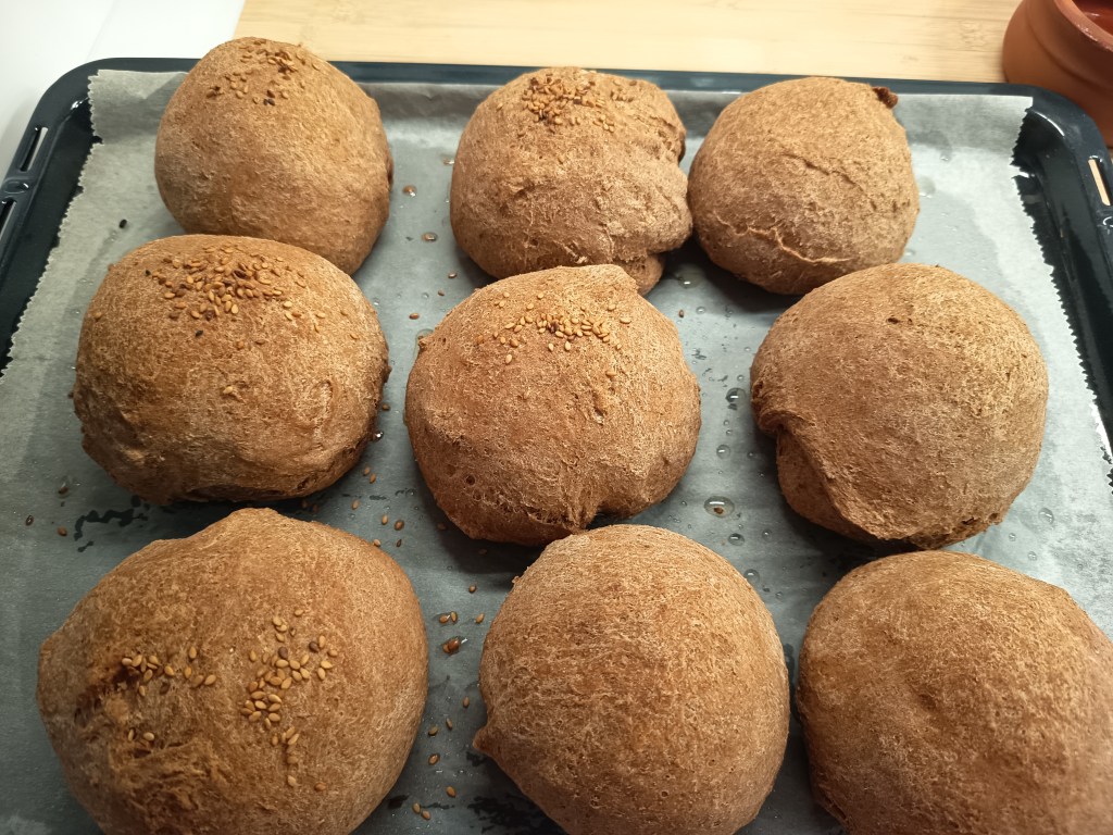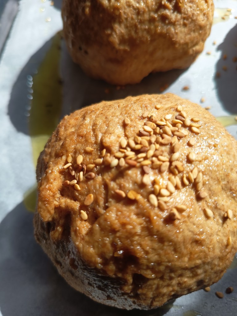 3. Când a expirat timpul, am deschis capacul și aluatul era crescut. Am format nouă pâinițe pe care le-am pus în cuptorul preîncălzit la 205 grade, ventilație sus-jos, pentru 35 de minute. Pe jumătate dintre pâinițe am pus și semințe de susan.