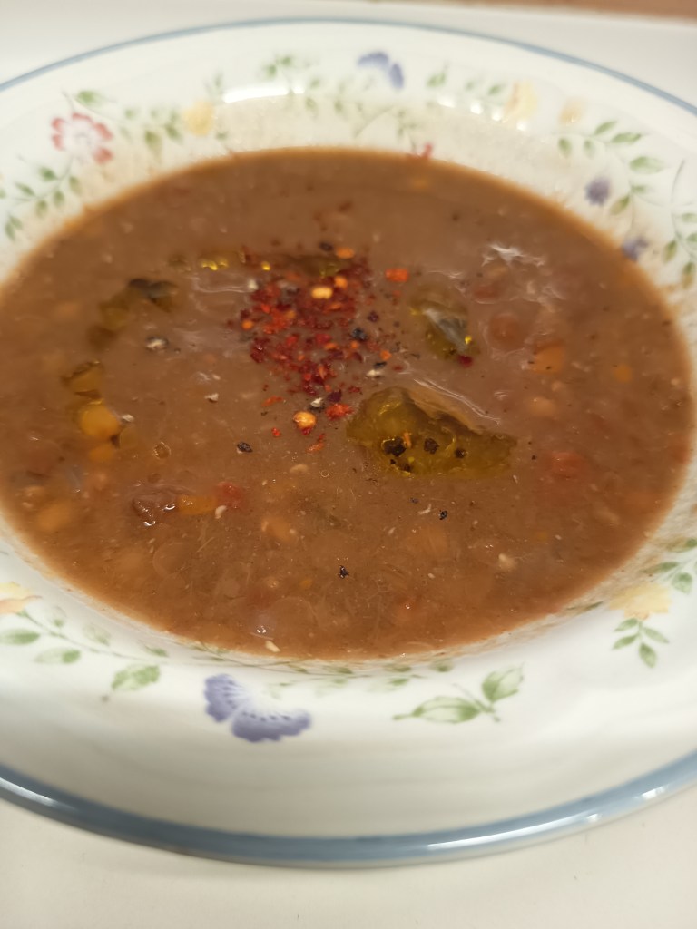 4. Când a expirat timpul, am scos rapid presiunea, am scos vasul de inox din multicooker și l-am pus pe aragaz. Cu un mixer vertical, am mixat ceapa, morcovul și o parte din linte. La final am adăugat cele două linguri de ulei de măsline.