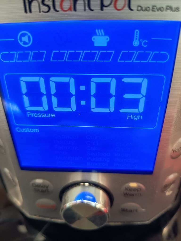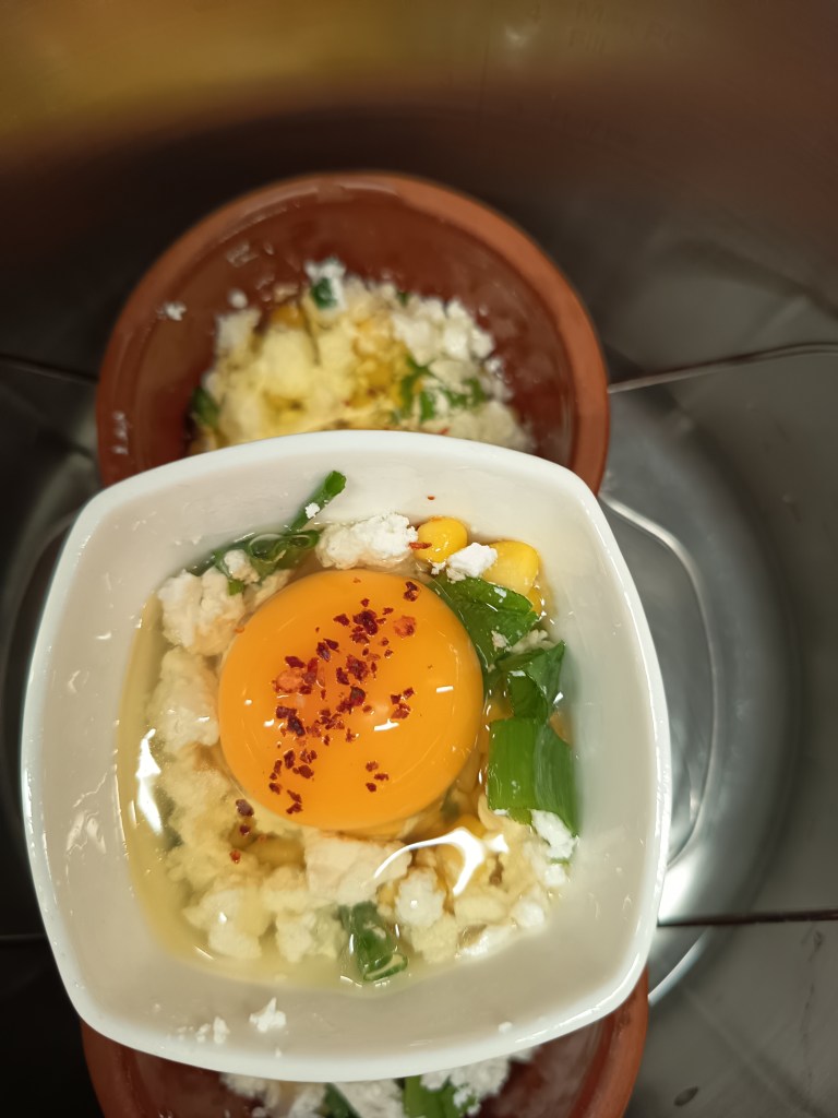 - Între timp, am uns cu jumătate de linguriță de ulei de măsline fiecare bol. În fiecare bol am adăugat apoi două lingurițe de porumb fiert,un cub de feta și ceapă verde. Apoi am făcut un mic „cuib” in mijlocul fiecărui bol și am pus deasupra un ou și condimentele. Am inchis capacul și selectat Pressure Cook, High, 3 minute. Când a expirat timpul de gătire, am eliberat rapid presiunea și am deschis capacul.