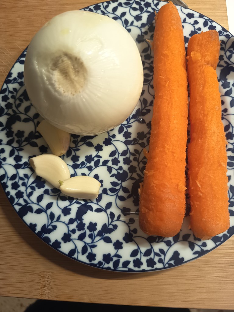 - În vasul de inox am pus două linguri de ulei de măsline, ceapă, usturoiul, morcovul, lintea, bulionul, condimentele și apa fierbinte (ca să intre mai repede în presiune și să nu trebuiască să aștept și încălzirea apei).