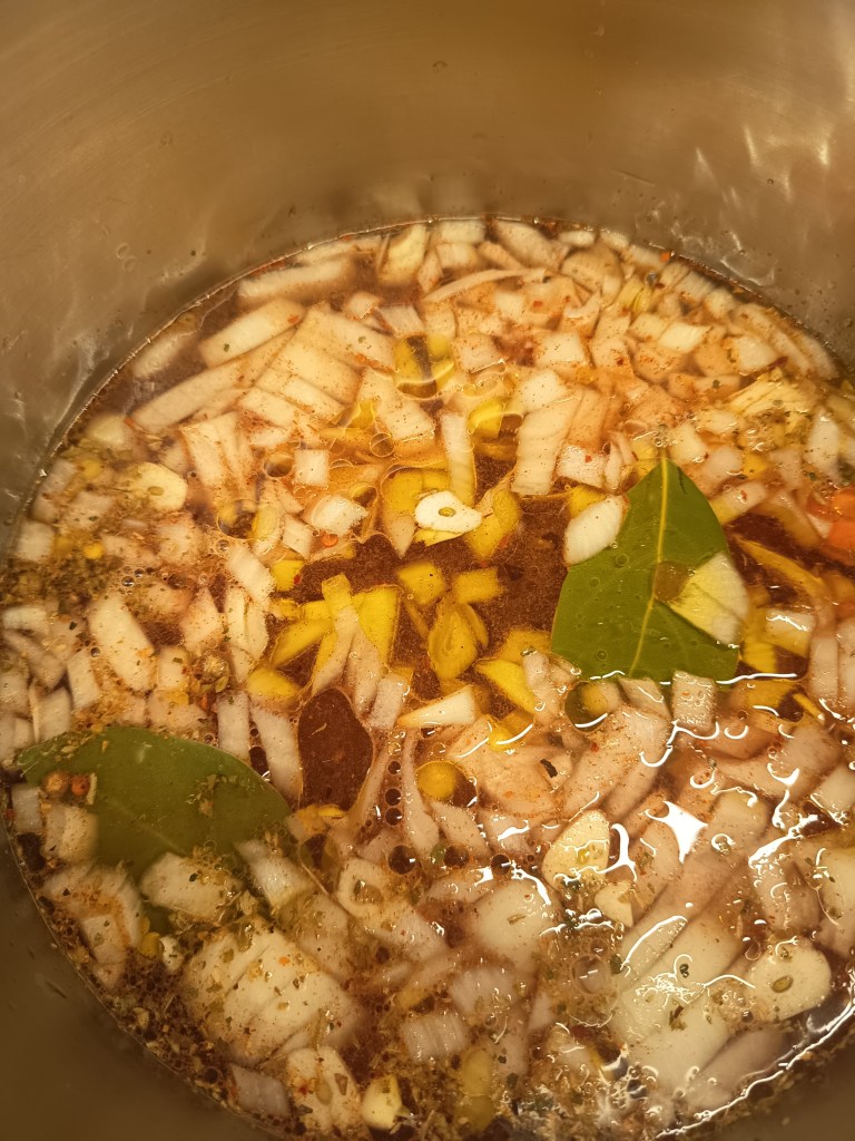 ✅ condimente: sare, piper, boia de ardei dulce, două frunze de dafin, jumătate de linguriță de chimen, o linguriță de oregano