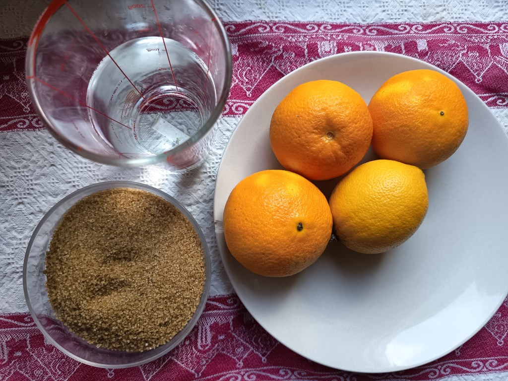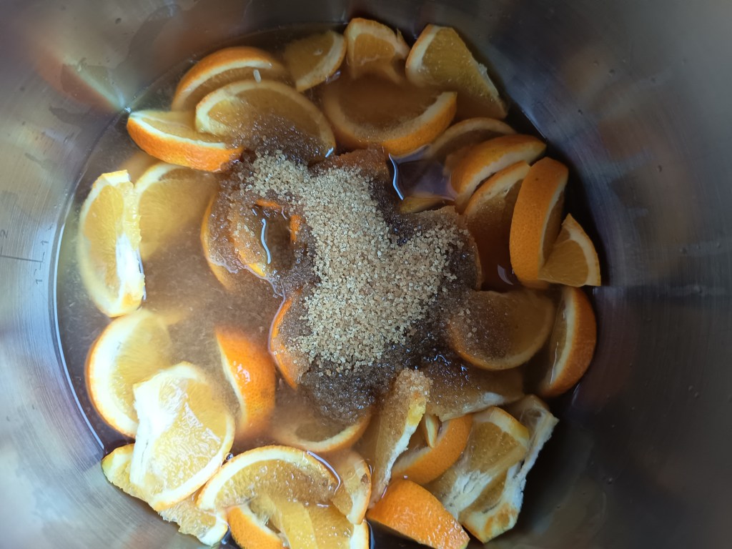 1. Am schimbat întâi garnitura și am pus-o pe cea roșie care este pentru preparatele dulci. În vasul de inox, am adăugat portocalele tăiate în semifelii (puteți să le tăiați cuburi ori bucăți mai mici, dacă nu doriți să folosiți blenderul vertical la final), apa, zahărul și sucul de lămâie.
