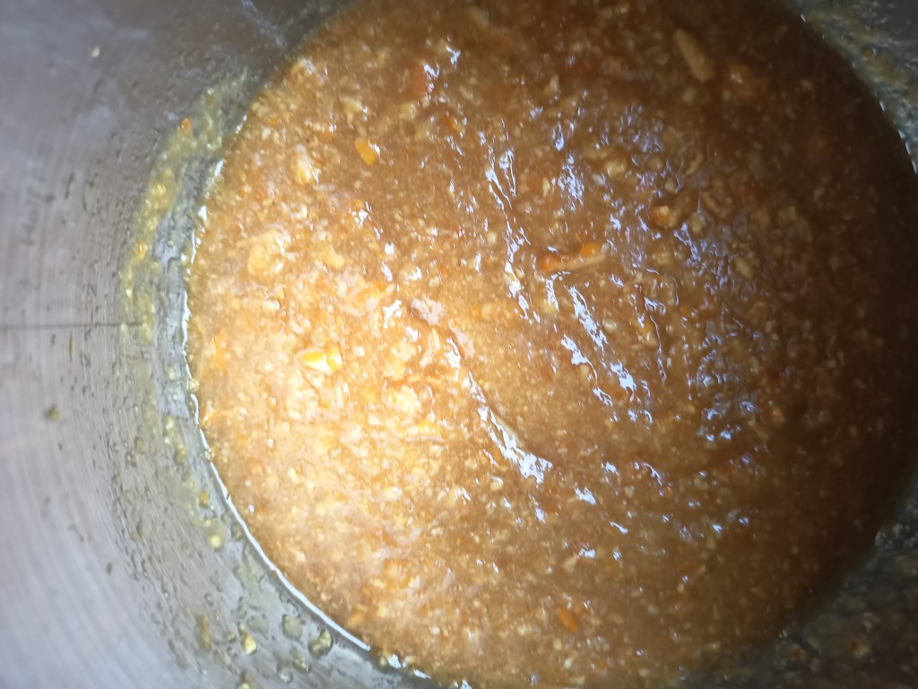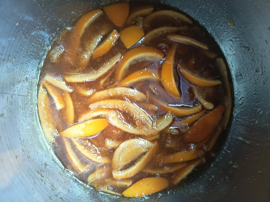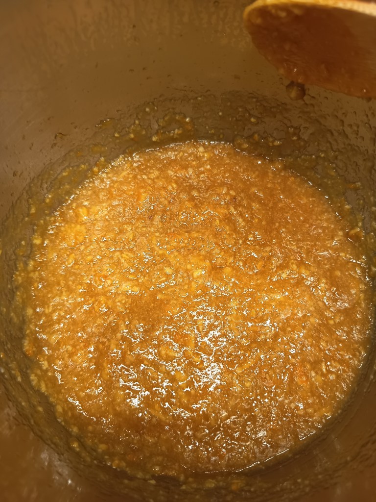 3. Când a expirat timpul de gătire, am scos rapid presiunea, am deschis capacul și am dezactivat Keep Warm. Am activat funcția SAUTÉ, amestecând în continuu în vas pentru 11 minute, până când a scăzut tot lichidul din vas (testul cu farfurioara rece din congelator mi-a arătat că gemul era bine închegat). Am scos vasul de inox din multicooker și am introdus în el blenderul vertical pentru a pasa gemul. Îl puteți lăsa și așa, dacă vă place să simțiți bucățile de portocale.