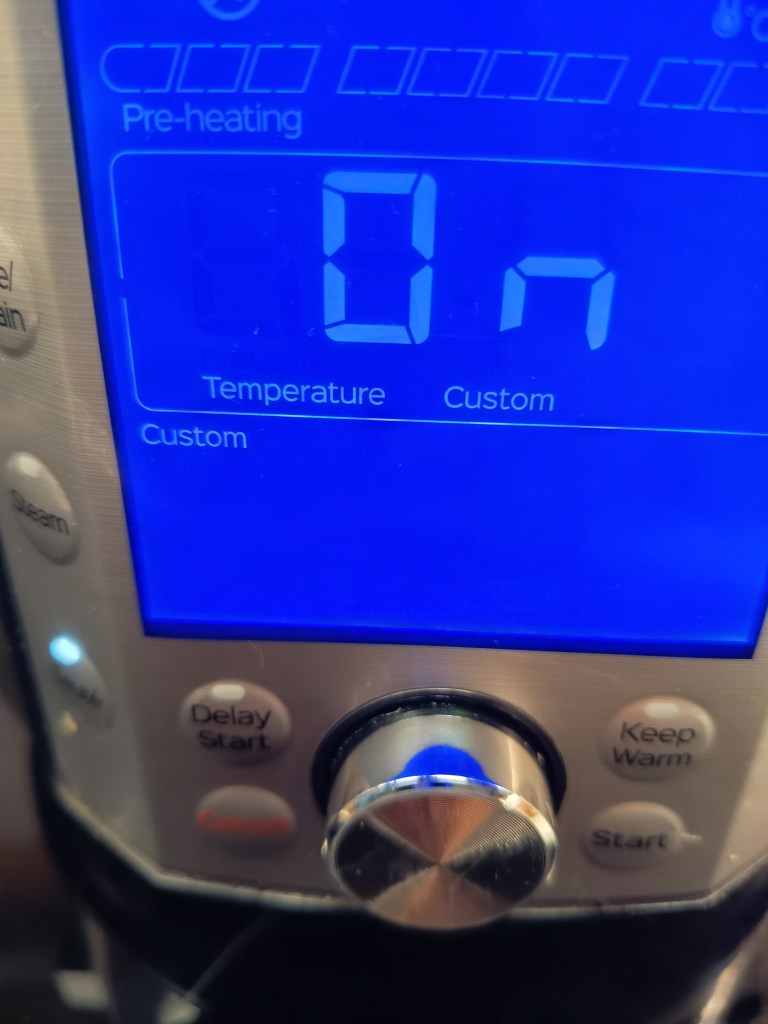 - După ce am terminat de curățat și de spălat cartofii, am pus o cană cu apă rece in vasul de inox al multicooker-ului și am pornit setarea Sauté. In felul acesta, până termin eu de tăiat cartofii in cuburi mari, apa se va înfierbânta și va intra mai repede în programul de presiune.