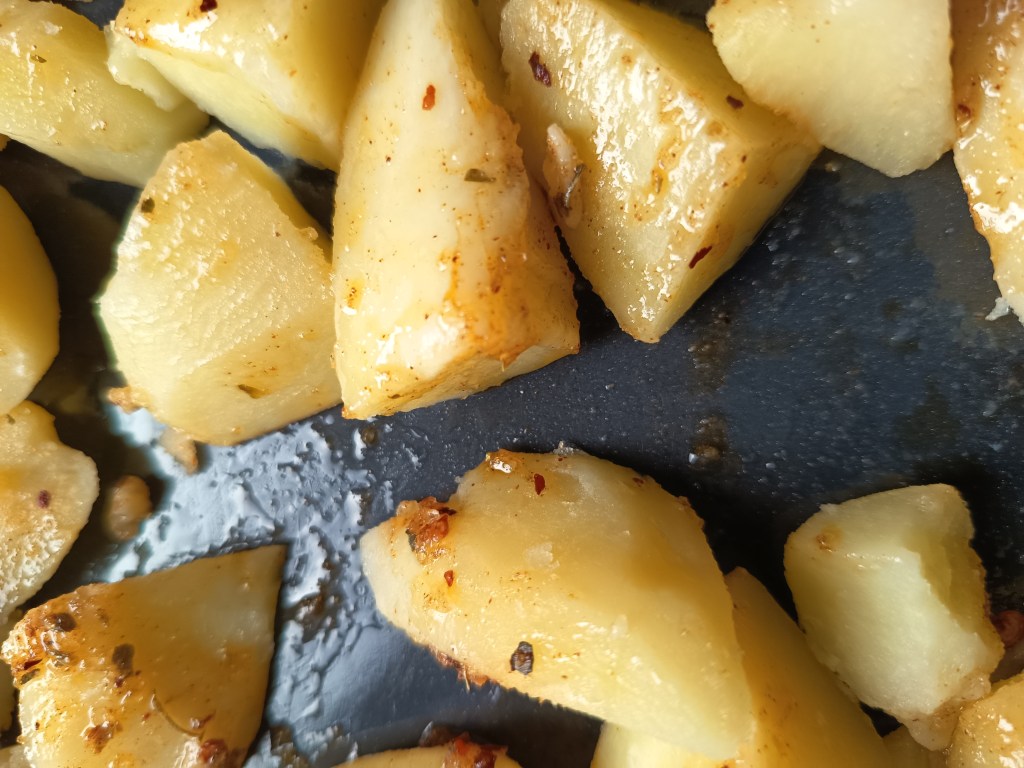 - Când a expirat timpul, am scos rapid presiunea (QR) și am pus cartofii într-o tavă și i-am uns cu amestecul obținut în pasul anterior. I-am băgat la cuptor pentru 10 minute. După ce au trecut primele 5 minute, i-am scos și i-am întors. Apoi, i-am pus iarăși la cuptor.