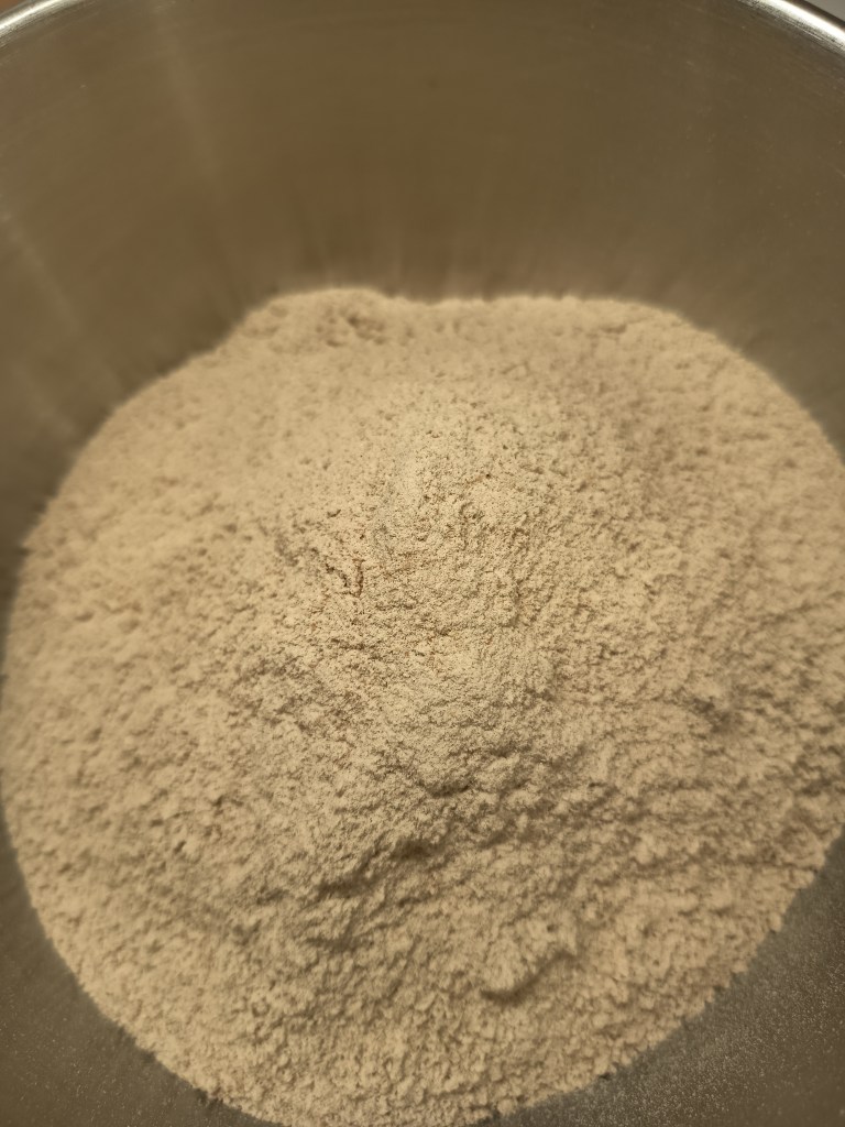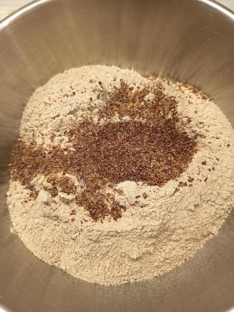 - Am pus apa la încălzit. Între timp, într-un bol am pus făina, semințele de in măcinate, drojdia, sarea și am amestecat totul cu o lingură. Când apa a început să se încălzească, am pus și apa. Am amestecat bine cu o lingură, cât să se combine toate ingredientele. Am adăugat două linguri de ulei de măsline și am început să frământ cu mâna.