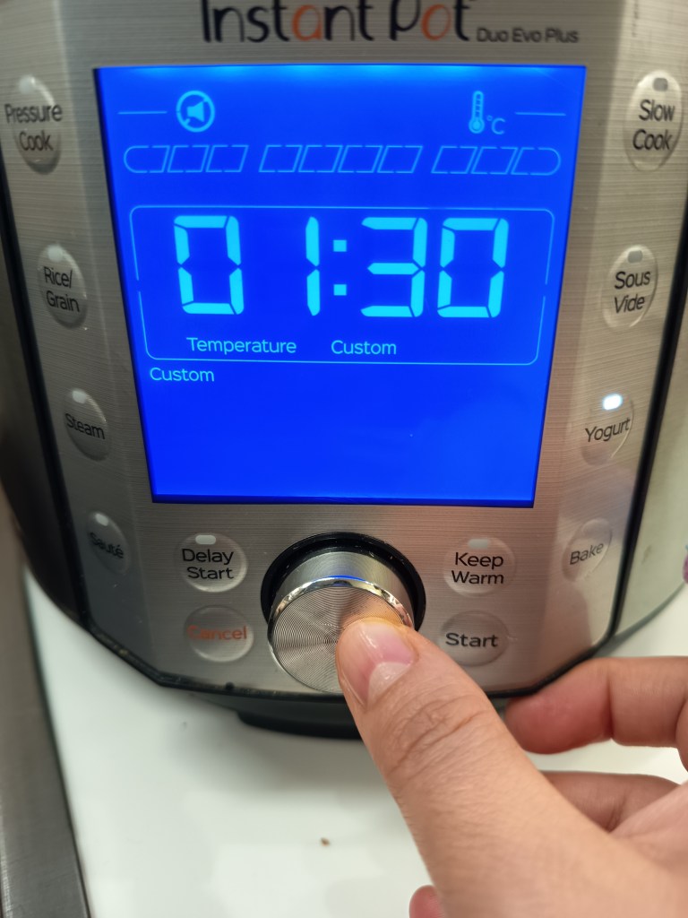 2. Am pus o lingură de ulei de măsline în vasul Instant Pot și, cu o pensulă am uns baza și pereții. În felul acesta aluatul nu se va lipi de vas și va fi foarte ușor de curățat. Am pus aluatul. Am închis capacul, am selectat opțiunea Yoghurt, Custom și, automat, a fost setată 1 ora și 30 de minute.