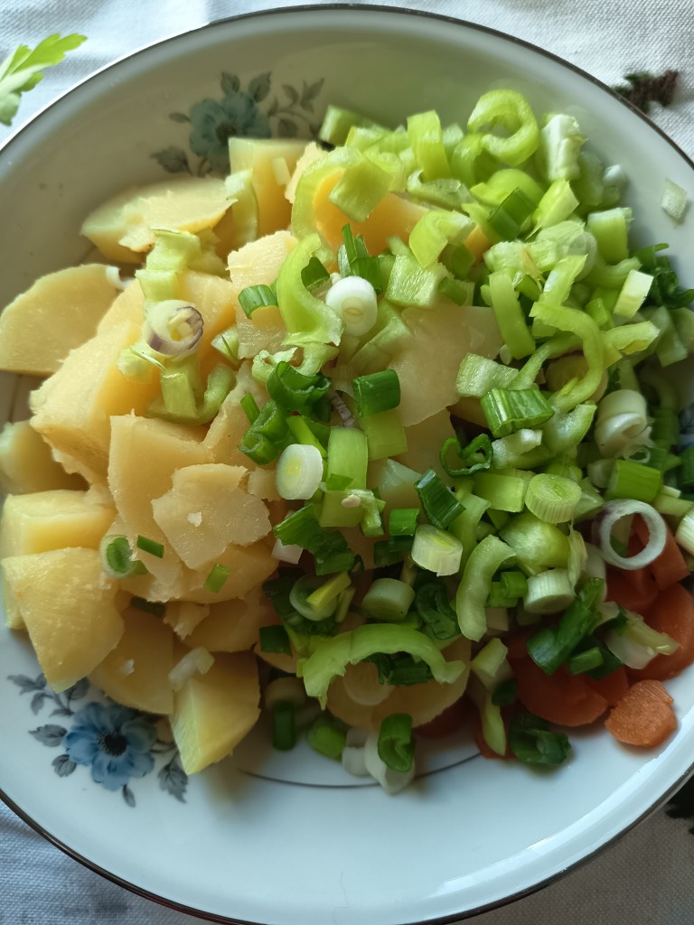 3. Între timp, am tăiat ceapa verde, ardeiul verde Am pregătit ingredientele pentru sos ( oțetul de mere, uleiul de măsline, muștarul, sarea și piperul).