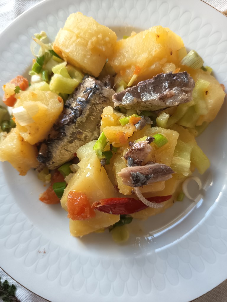 4. Când a expirat timpul, am scos rapid presiunea (QR), am curățat cartofii și morcovul, i-am tăiat. Peste ei am adăugat sosul, ceapa verde, ardeiul verde. Am amestecat bine să se întrepătrundă aromele și apoi, in fiecare farfurie am adăugat câteva bucăți de sardine din conserva mea de Sardine cu ardei iute în ulei. Eu am lăsat uleiul deoparte, dar dacă doriți, in loc sa puneți ulei de măsline, puteți adăuga uleiul de la sardine.