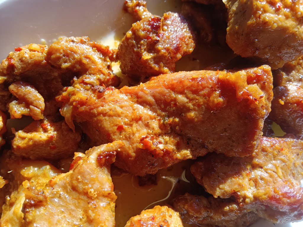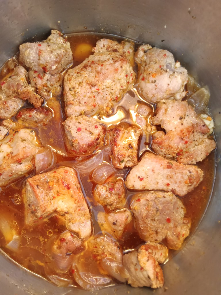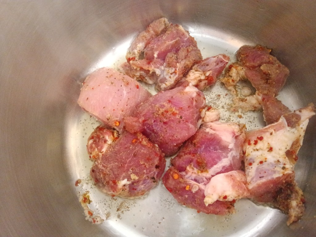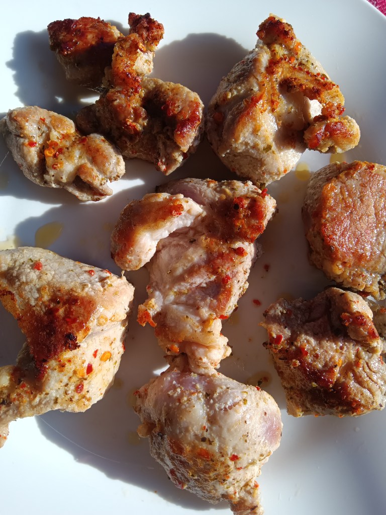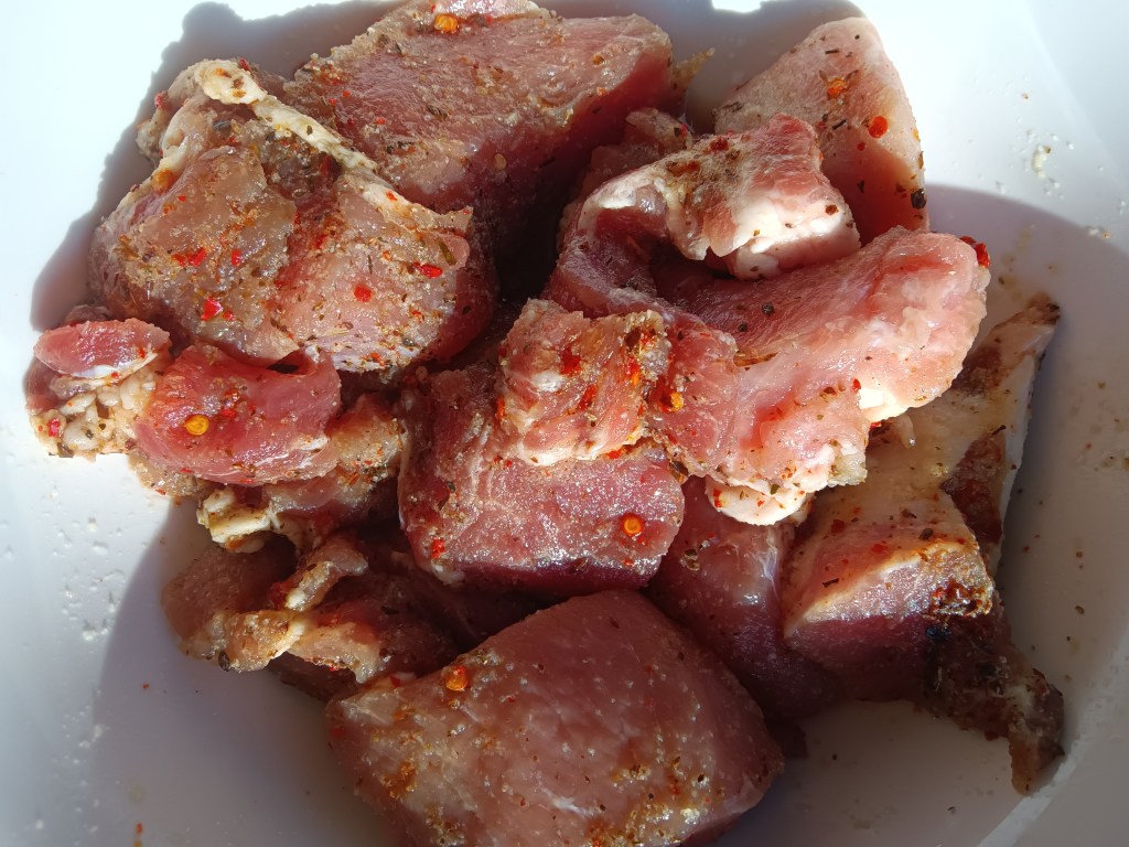 - Am pregătit mușchiul de porc tăindu-l în bucăți potrivite și l-am pus la marinat cu o seară înainte în o lingură de ulei, sare, piper, cimbru, boia dulce și doi căței de usturoi.