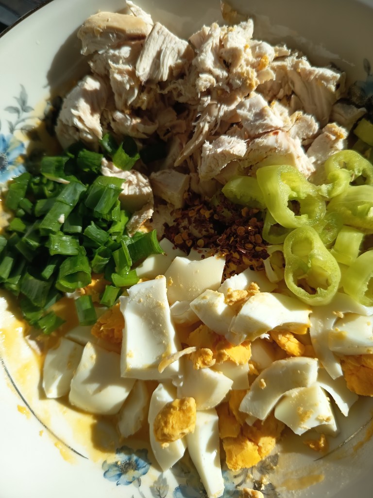 Cu o zi înainte pregătisem un pui întreg la Instant Pot și încă mai aveam carne. Am pus două ouă la fiert la Instant Pot folosind metoda 5-5-5 (Pressure Cook, High, 5 minute, lăsată să scadă presiunea 5 minute și apoi puse în apă rece încă 5 minute), am tăiat legumele, carnea și ouăle și gata.