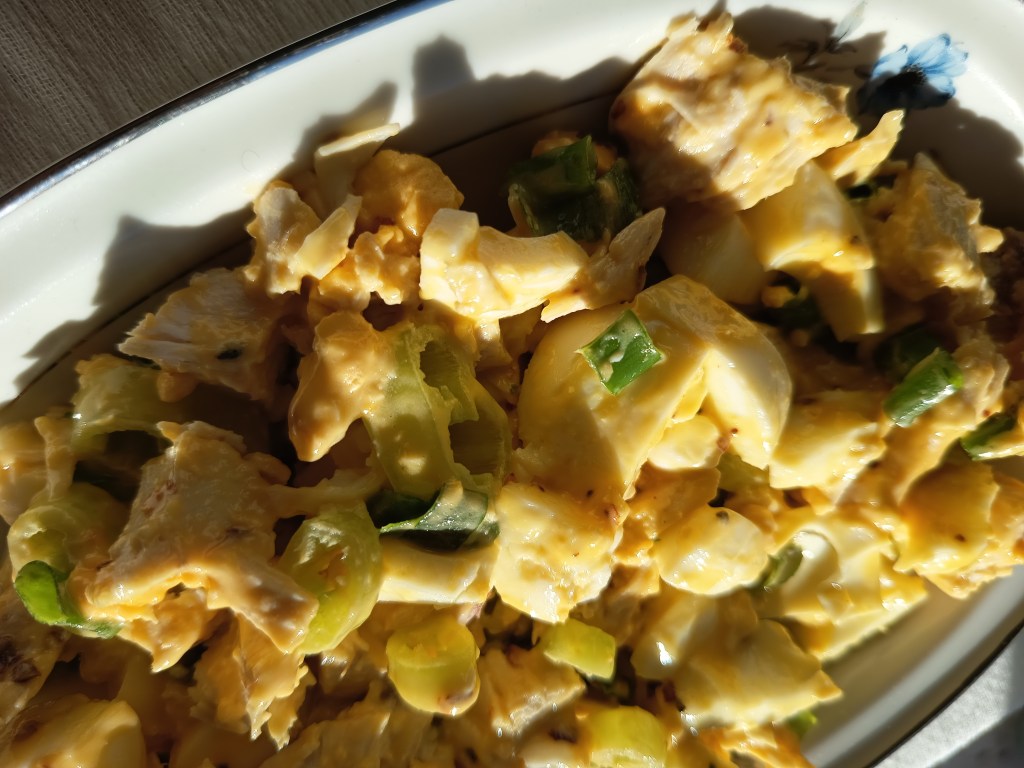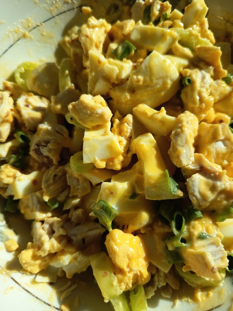 - Am pus într-un bol pieptul de pui tăiat, ceapa verde, ardeiul iute și ouăle tăiate cuburi. Am adăugat condimentele, muștarul și maioneza.