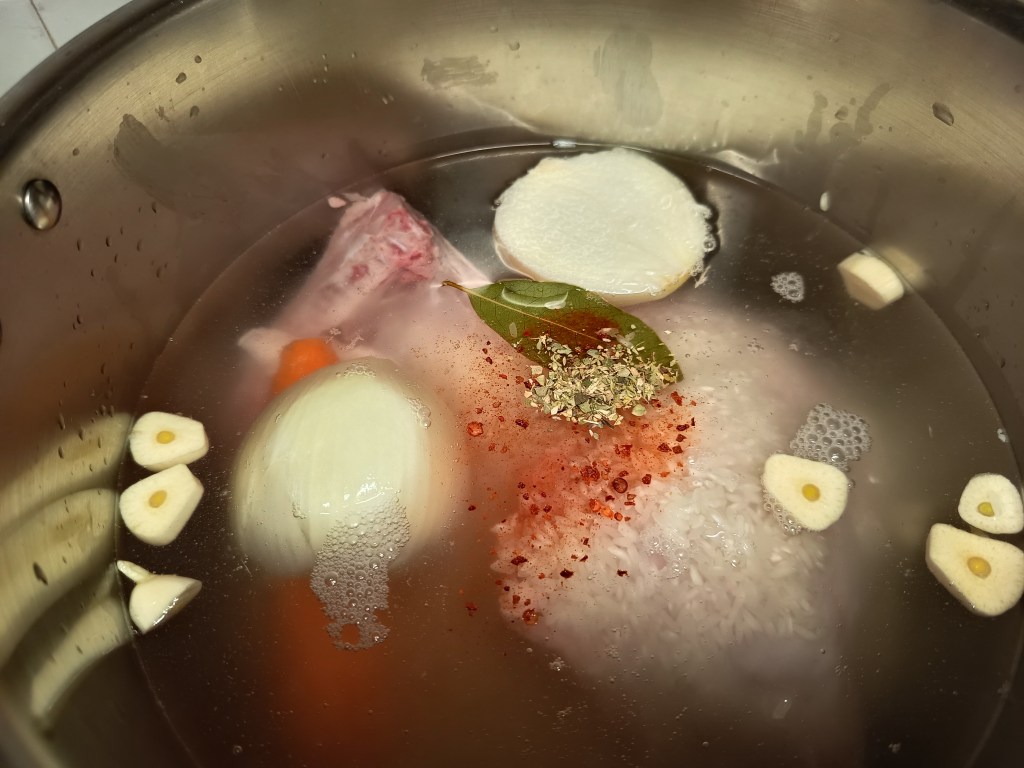 - Am pus în vasul de inox carnea de pui, orezul, ceapa tăiată în două, morcovul întreg, usturoiul rondele, țelină rasă și tăiată. Am adăugat condimentele și apă rece. Am amestecat.