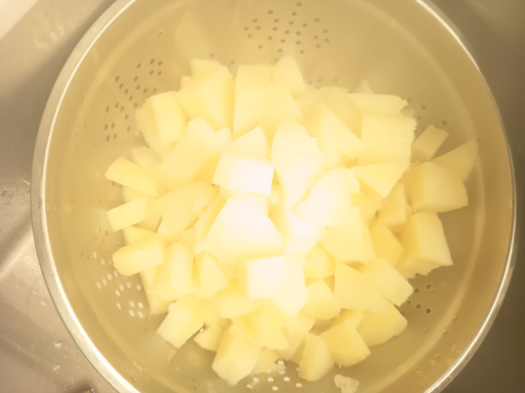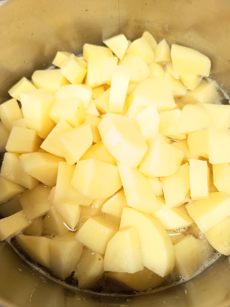1. După ce am terminat de curățat și de spălat cartofii, am pus o cană cu apă rece in vasul de inox al multicooker-ului și am pornit setarea Sauté. In felul acesta, până termin eu de tăiat cartofii in cuburi mari, apa se va înfierbânta și va intra mai repede în programul de presiune.