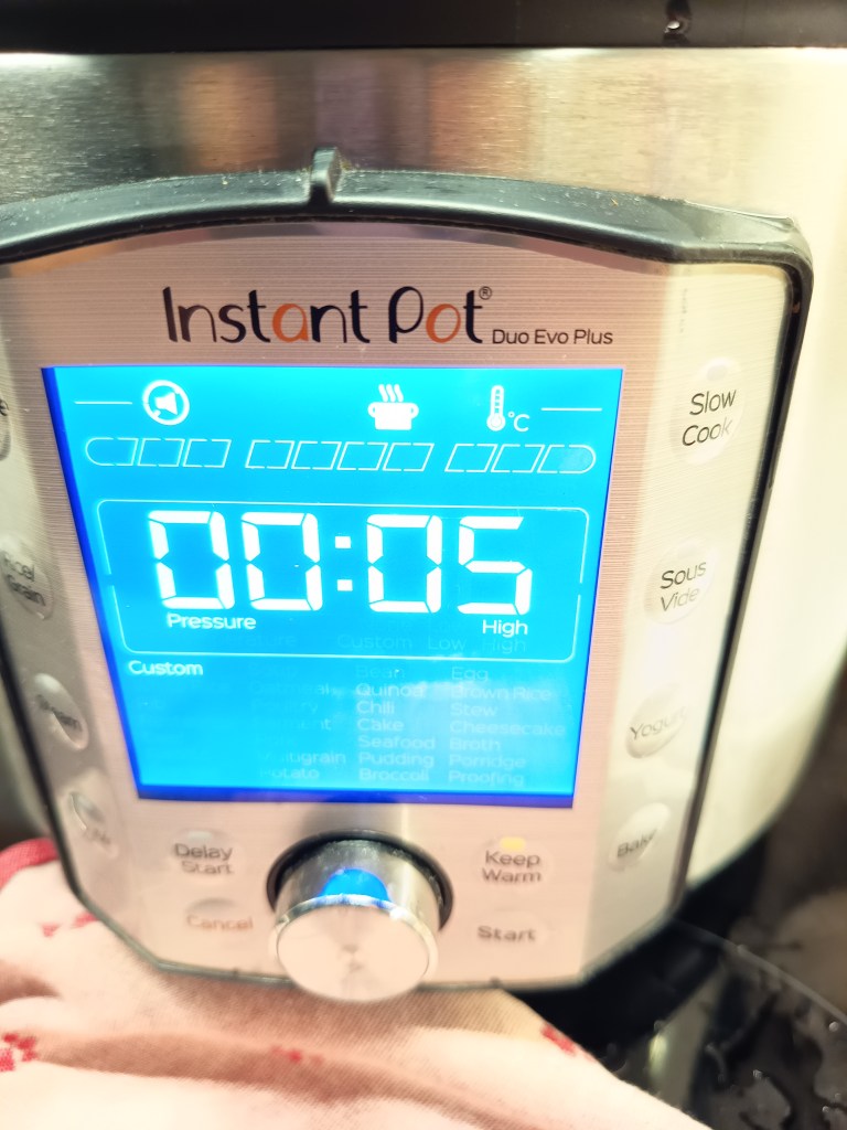 2. Am pus cartofii in vasul de inox și am mai adăugat jumătate de cană de apă rece. Am închis capacul și am selectat Pressure Cook, High, 5 minute.
